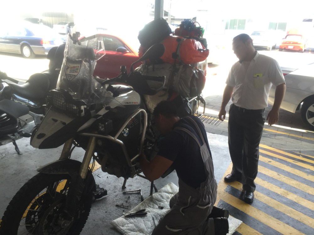 Hoy tocó levantarse temprano para llevar la moto al taller, a las 8:15 a.m. que abren, ya estaba allá. La atención fue increible, Pablo y Francisco que fueron las personas que me recibieron la moto, demasiado atentos y amables, quedé impresionado con la rapidez del servicio. Mi moto pasó de primera y eso que ni tenía cita, apenas se demoraron una hora y media. Francisco verificó nivel de aceite, el o-ring, presión de llantas, tensión de cadena, le hizo un remiendo al lubricador automático de cadena (que era lo que tenía fuga), el aceite estaba un poco bajo así que lo nivelaron, se apretaron un par de tornillos y listo (hasta calcomanías de Motorrad Ecuador me regalaron, por supuesto les regalé un par de las mías y les comenté de mi página web), todo al gratín y cortesía de BMW Motorrad Ecuador… Me regalaron un líquido para sacar las manchas de aceite/grasa del traje de la moto y todo (que las quitó como en un 80 % 👍🏻). Quedé muy agradecido con ellos, ya que después de la mierda de atención que recibí la noche anterior en el hostal, la verdad fue demasiado bueno comprobar que no es algo común en Guayaquil (como me lo estaba imaginando, incluso después de que un Sr. me preguntara en un semáforo que de dónde venía y me dio la «bienvenida» a su ciudad ) sino algo del puto manager del Tomo Hostel, lástima, porque en serio el lugar tiene un ambiente muy bacano y es muy moderno, además de las excelentes camas y duchas… Atención de mierda eso sí…