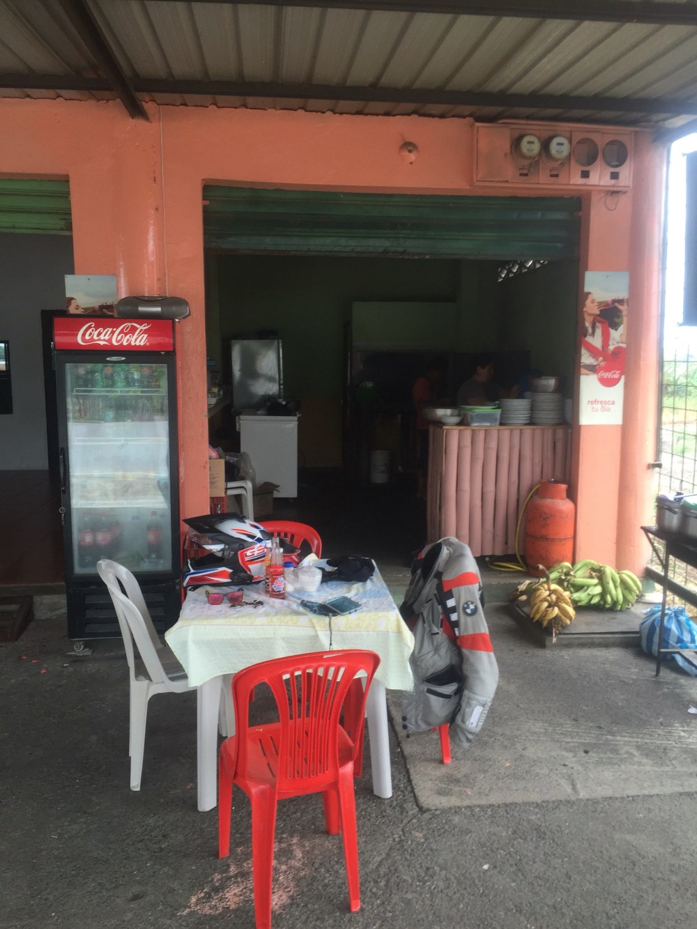 Ya a las 10:00 a.m., después de salir del taller y comprobar que lo de la moto no era nada grave, gracias a Dios, y que sólo estaba un poco baja de aceite, estaba camino a la frontera… Como a las 10:30 a.m. me entró una filomena (hambre) muy brava, así que paré en el lugar donde habían más camiones (esos manes conocen…). Tenían unos nombres demasiado raros para la comida (seco de pescado, menestra , etc.) así que le dije a la señora que como ni ella me entendía lo que yo le pedía, ni yo le entendía lo que ella me decía, me mostrara lo que me estaba ofreciendo… Al final le pedí huevos con tocineta, queso, arroz y pan, porque aunque tengo estómago de gamín, no sé si hubiera sobrevivido a esa experiencia culinaria… Acá les dejo foto del «restaurante», como diría mi papá: «con derecho a poquito mugre», Uds juzgarán…