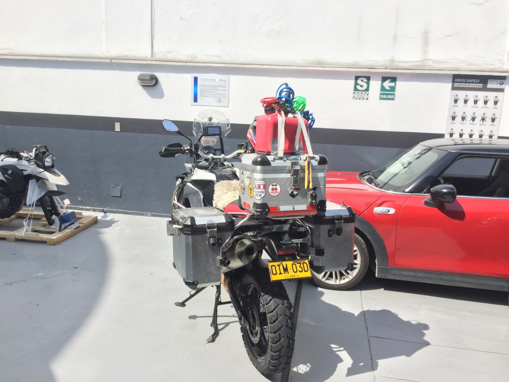 ¡A madrugar se dijo! Dejé las maletas listas y Gonzalo me hizo el favor de llevarme al taller (Gildemeister de la Javier Prado Este, 5535) por la moto. Ya estando allá, pregunté si tenían las maletas laterales de mi moto (que no pude conseguir en Colombia ni en Ecuador). Para mi sorpresa, sí las tenían, pero los cerraduras no y llegaban hasta después de las 10:00 a.m. Como todavía teníamos tiempo, nos fuimos a Touratech (que queda lejísimos, en Chorrillos), ya que el man que atiende allá es un duro con temas de GPS y sabe bien cómo es la vuelta… La tienda es demasiado grande y tienen de todo, aunque el man no estaba y supuestamente llegaba a medio día… Estando allá, cambié calcomanías con Johaan, quien fue la persona que me atendió y pude ver que estaba la moto del alemán que está dándole la vuelta al mundo en una Sertão (patrocinado por Touratech). Quedamos en que regresaba antes de la 1:00 p.m., pero como en el taller de BMW se demoraron más de lo pensado, en traer los cerrojos de las maletas laterales y configurarlas con la llave de la moto, no alcancé a pasar después porque no quería que me cogiera la noche para arrancar a Huacachina.