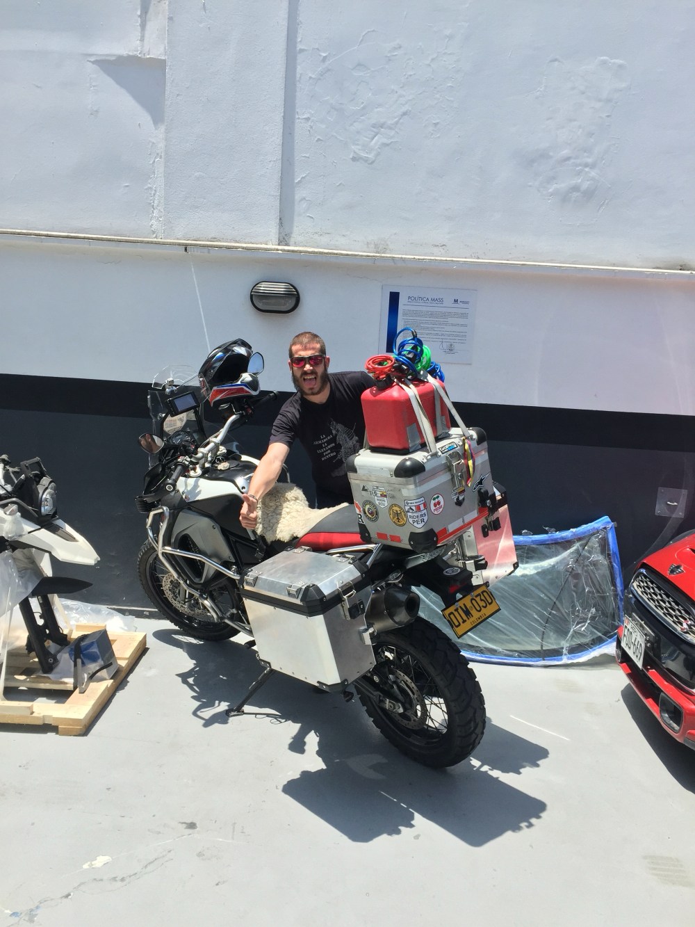 Ya de regreso en el taller y siendo casi las 12:00 m.d., hablé con varias personas acerca del tema del GPS y el documento de BMW Motorrad con toda a info de los concesionarios en Latinoamérica que bajé de internet, llegamos a la conclusión de que el documento estaba mal porque ninguno reconocía el formato de coordenadas que nos daban (tal vez el Navigator). Les di un par de calcomanías de las mías y ellos de Riders Perú. La persona que muy amablemente me aguantó mientras lo acosaba cada cinco minutos por mi afán de salir rápido, fue Alvaro Díaz, habían dos más que me ayudaron mucho e incluso me consiguieron descuento del 10 % en las maletas, pero infortunadamente no recuerdo sus nombres (se me pasó pedirles su business card). Muy buena la atención de este taller, aunque muy costoso todo (como en Lima y con la relación peso colombiano/dólar en su máximo histórico, qué más podría esperar). Al final las maletas me salieron como 200 dólares más caras que en Colombia, pero por fin las pude conseguir.