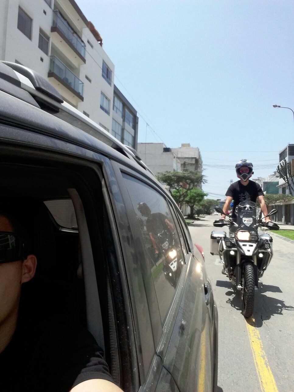 Acá aprovechando los policías acostados (speed bumps) de Lima, para picar la moto y feliz con mis maletas laterales: