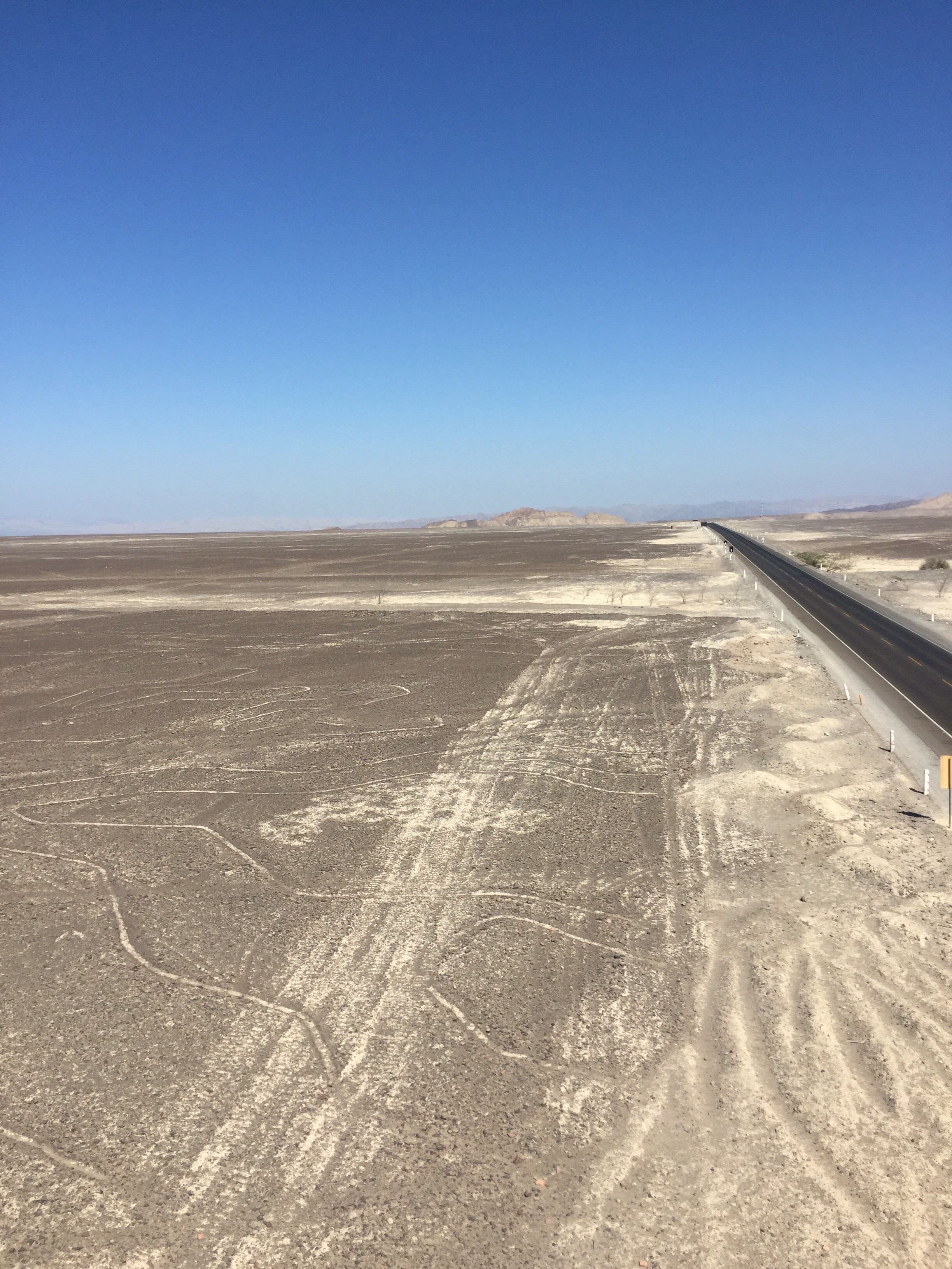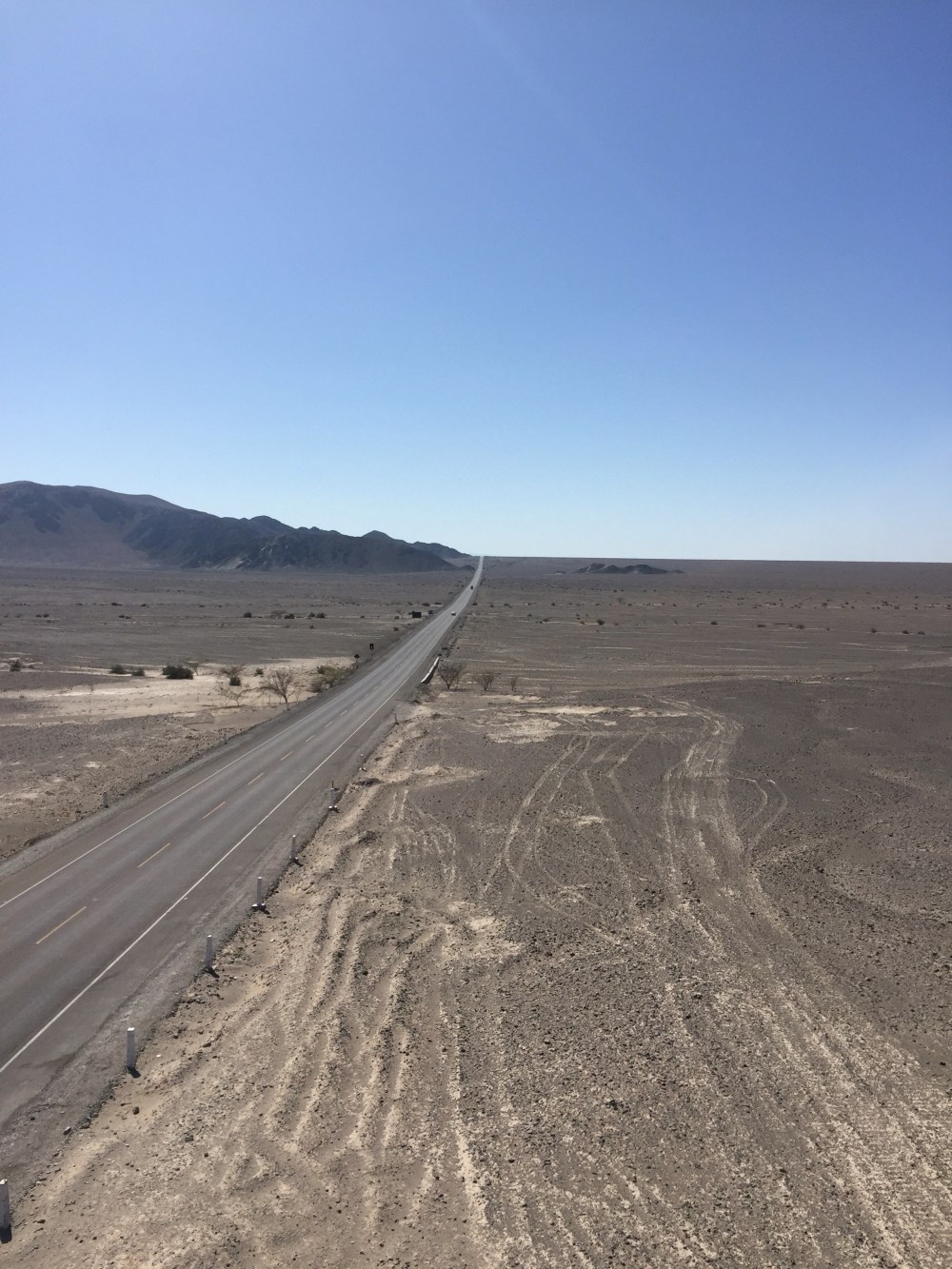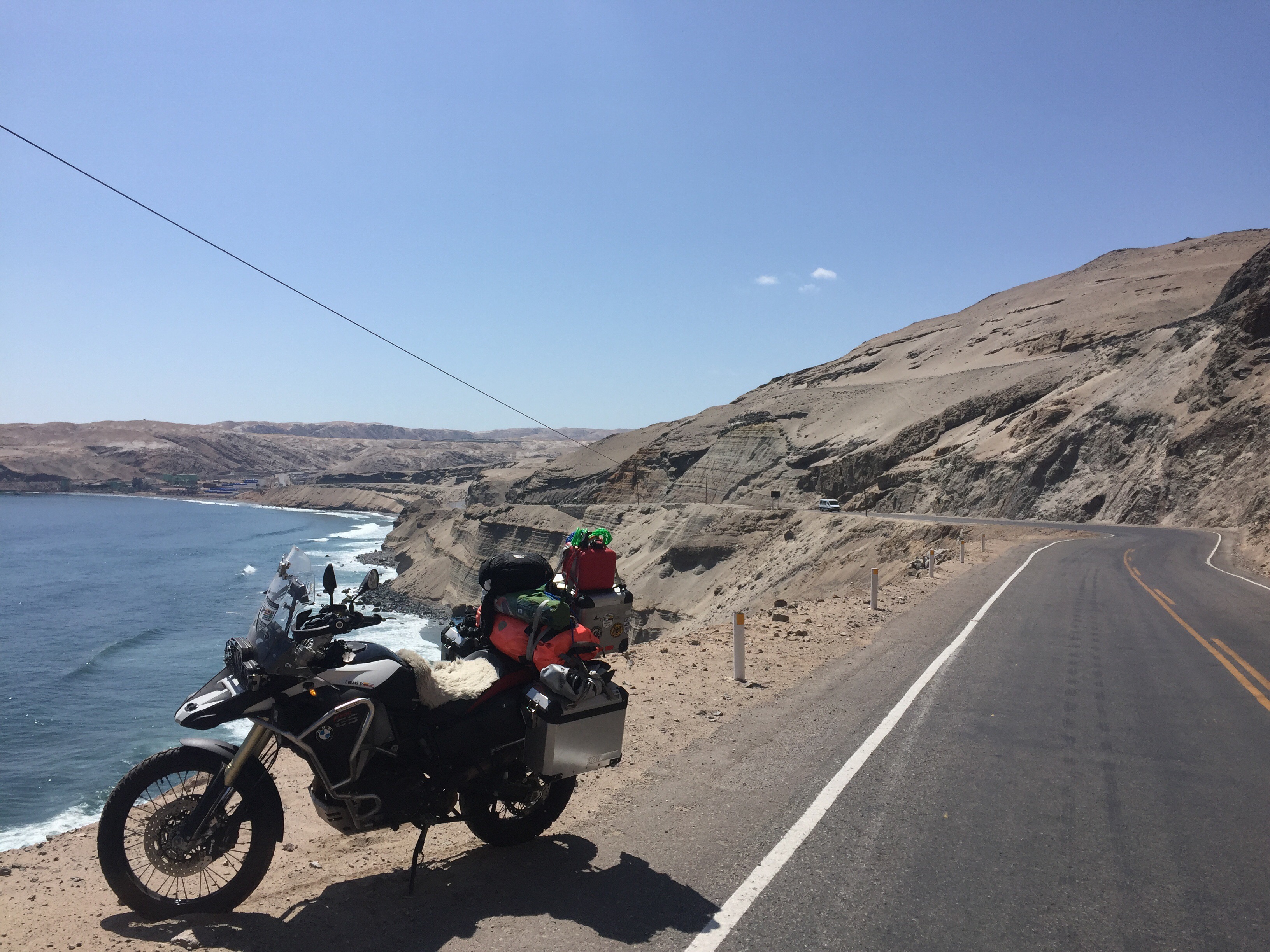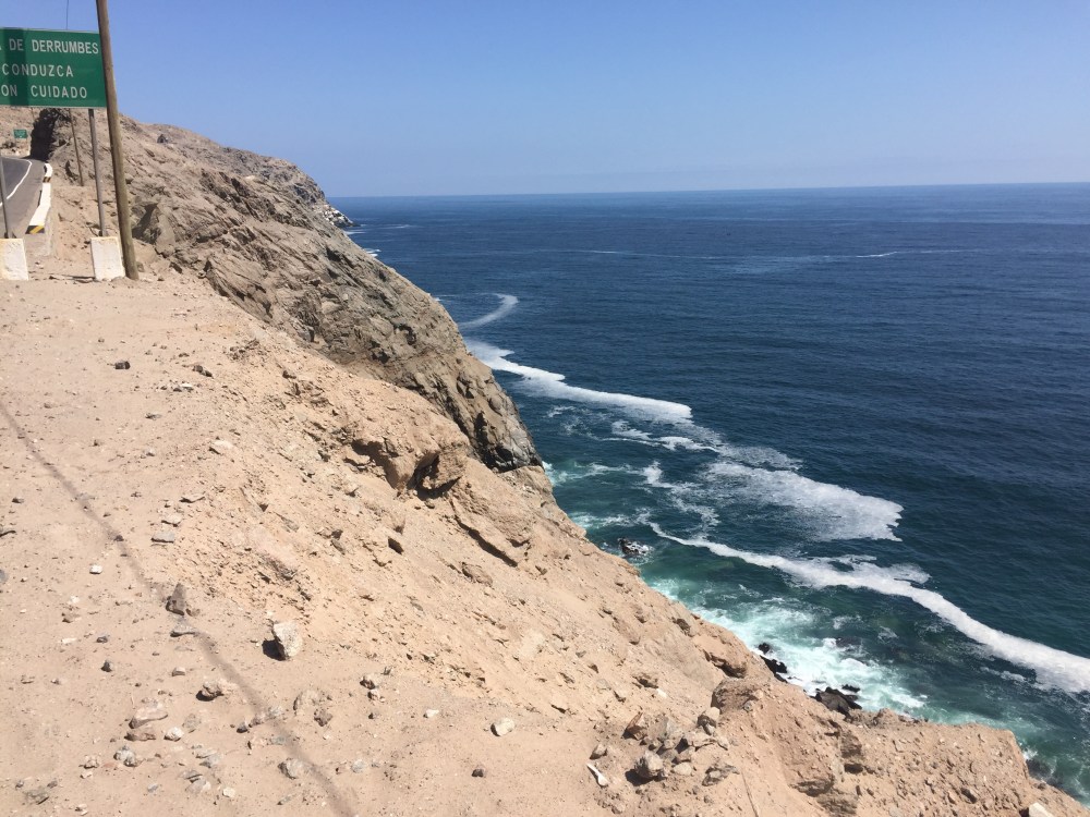 La carretera es muy bacana después de Nazca, cuando uno llega a la costa, empiezan las curvas y se va bordeando el mar. Esta vía tiene una protección muy precaria y uno no deja de pensar en qué pasaría si se fuera por el voladero… Al lado izquierdo tampoco hay buen pronóstico, porque la arena parece que se fuera a comer la carretera en cualquier momento. En ciertos tramos uno se siente como manejando por Marte.