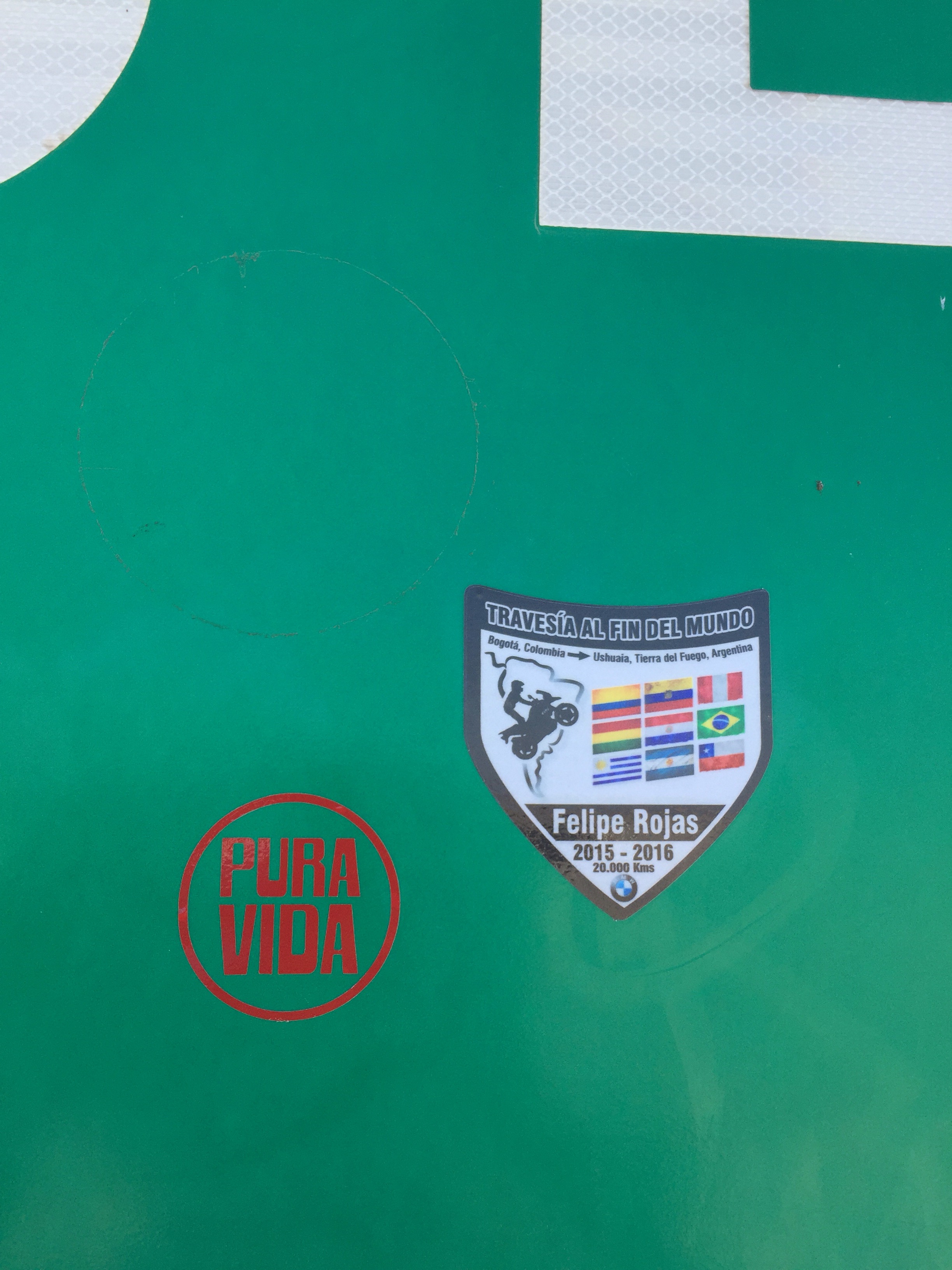 Mi calcomanía al lado de la de pura vida (dicho costarricense), que pegó Sebastián Carmona la semana pasada: