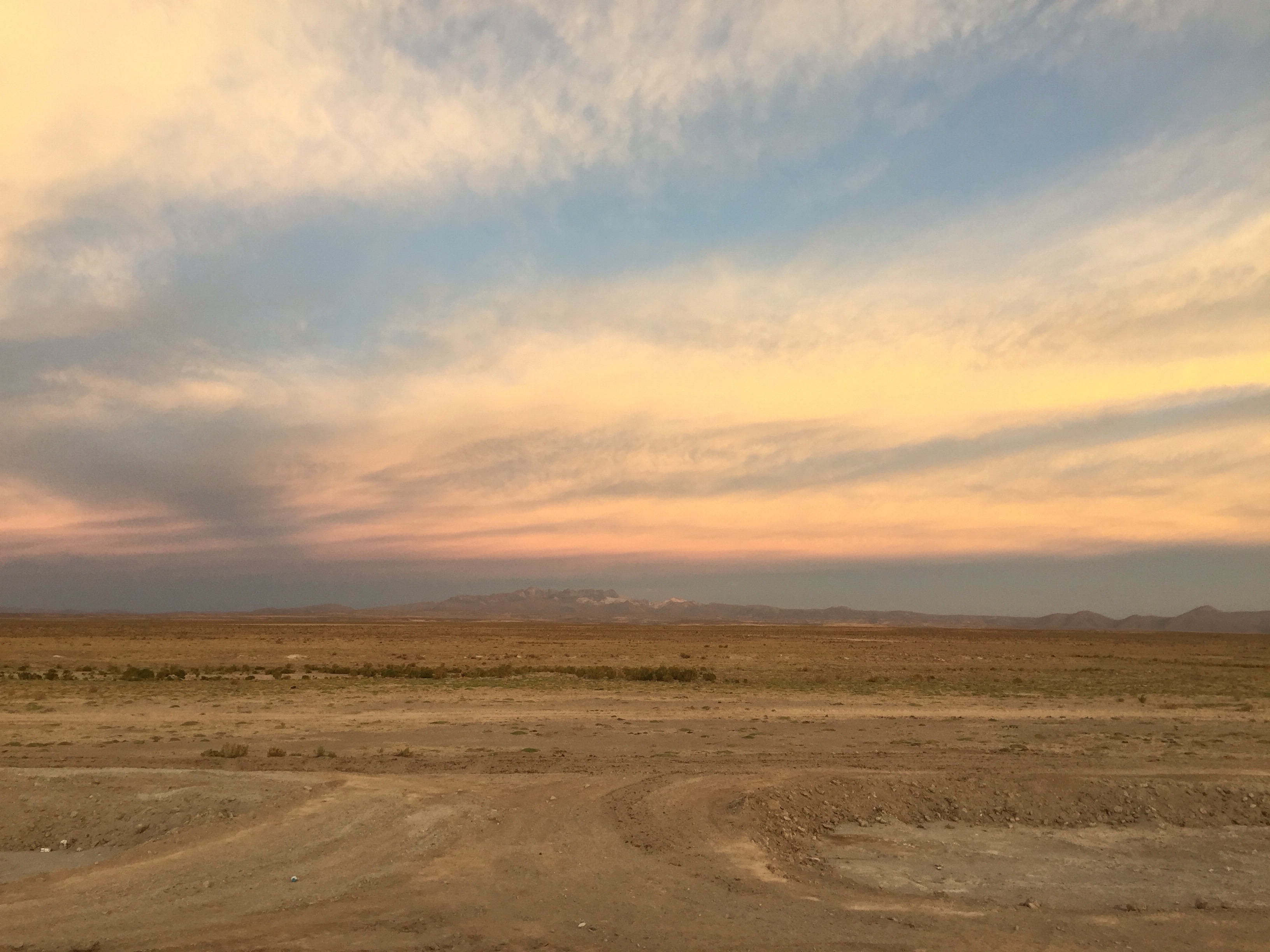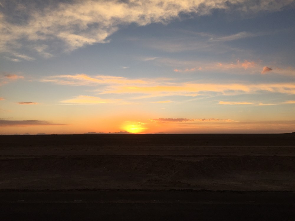 Regreso al hotel de ellos, pregunto si tienen disponibilidad… Me dicen que si no llega una reserva, tendrían disponibilidad, pero está estúpidamente caro y no tienen parqueadero… Lo más importante del viaje ha sido que haya parqueadero para mi moto. Decido jugármela e irme a conocer un hotel de sal, sin haber conseguido dónde quedarme por las siguientes tres noches… Camino al hotel, otra vez el GPS me mete por el peor camino posible… Me manda a cruzar una vía de tren, trampas de arena, muchos baches, etc… Aunque con esta vista…