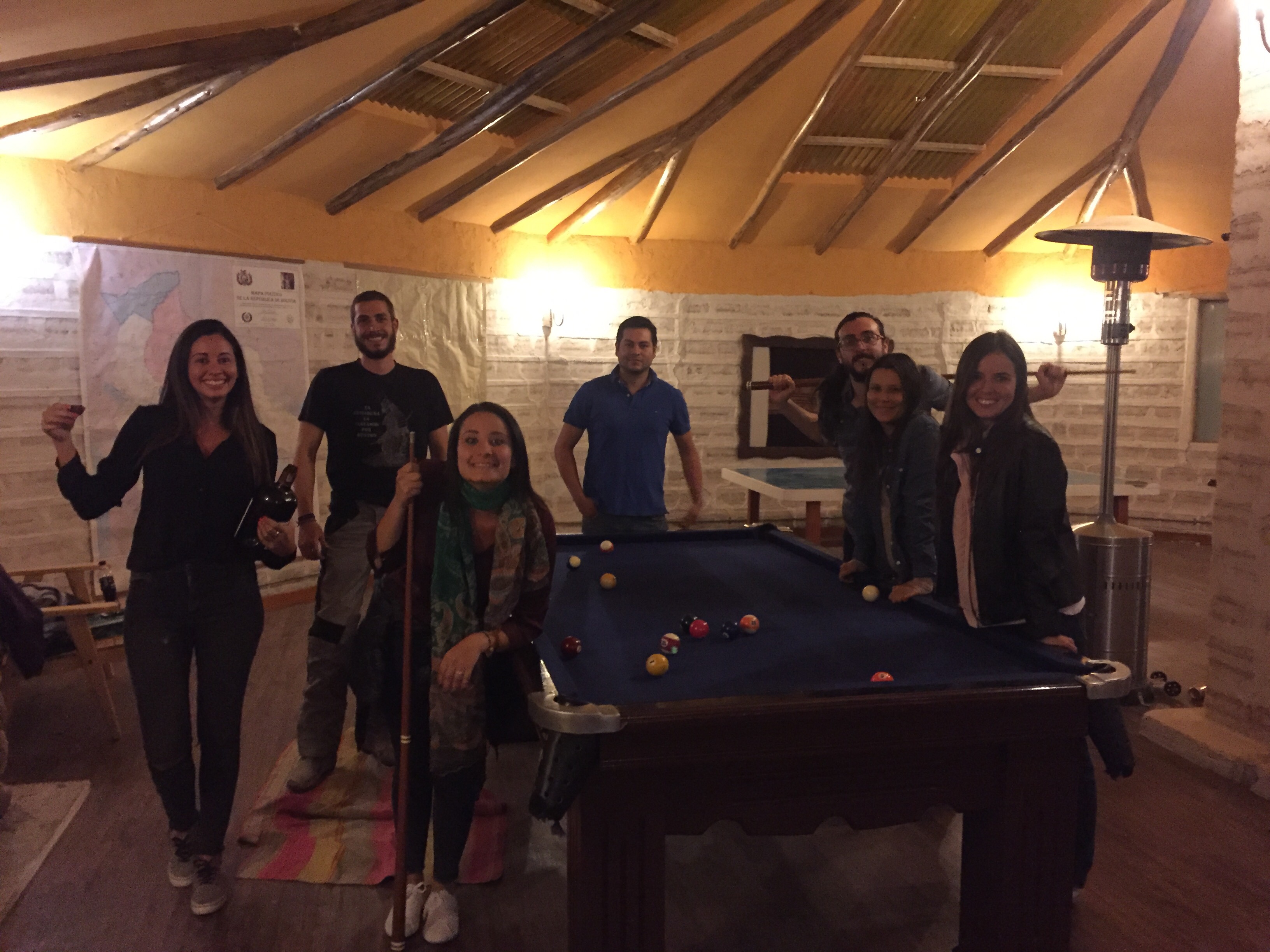 Ya en el hotel Luna Salada (a 30 km de Uyuni y cerca a Colchani), conozco a María Andrea y a Humberto, quienes también trabajan para Red Bull Bolivia y a Rubén, el dueño del hotel… ¡La atención y comida, excelentes! El hotel, muy bacano… Todo hecho en sal, tiene tres pisos y es el único que queda en una colina: