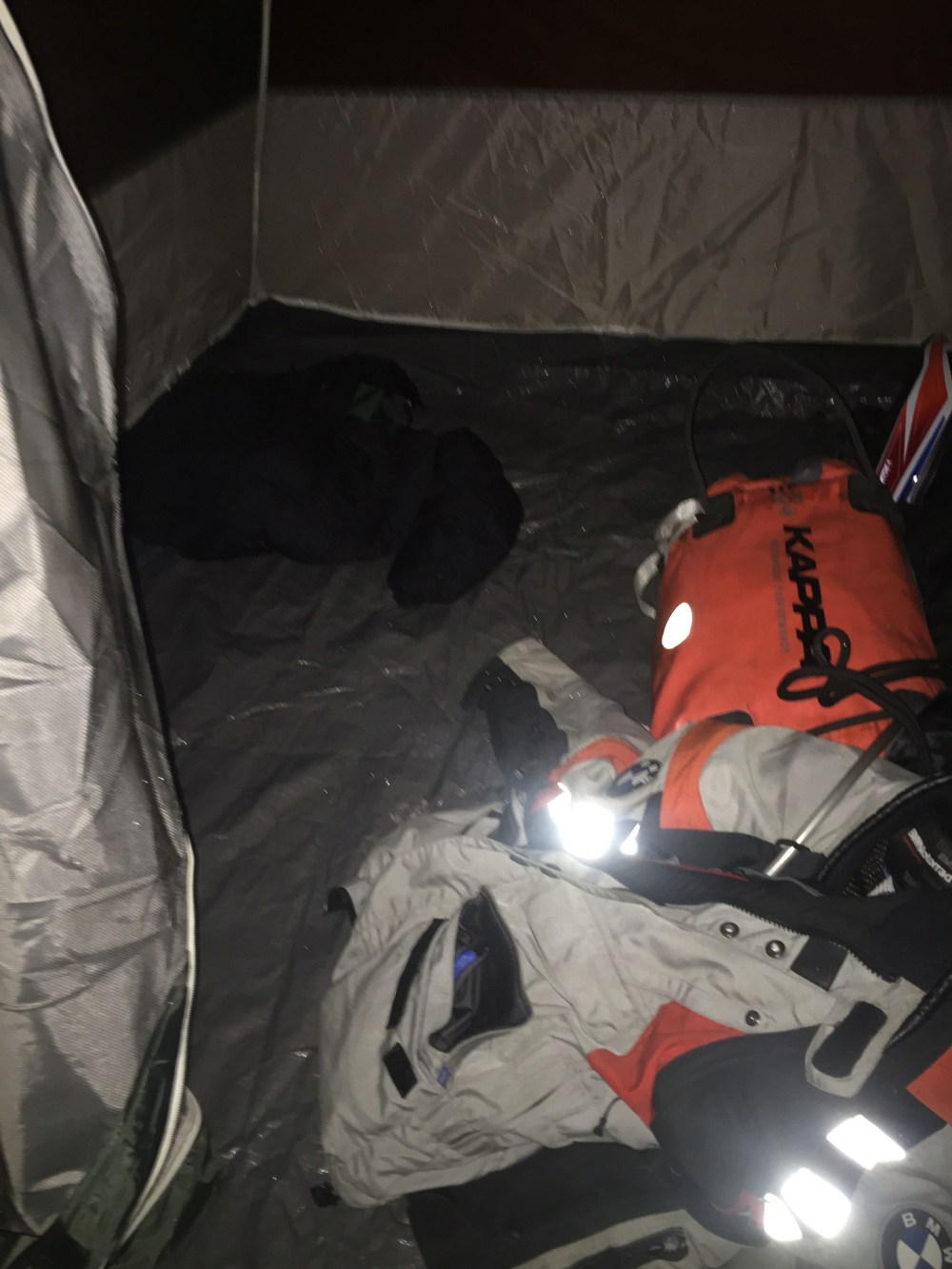 A las 2:00 a.m., cuando termino de armar la carpa, me doy cuenta de que se me olvidó bajar el colchón inflable (que estaba en una de las maletas laterales). Imposible que la señora me abriera la puerta a esa hora, entonces me resigné y eché a dormir en el piso con el softbag naranjado de almohada: