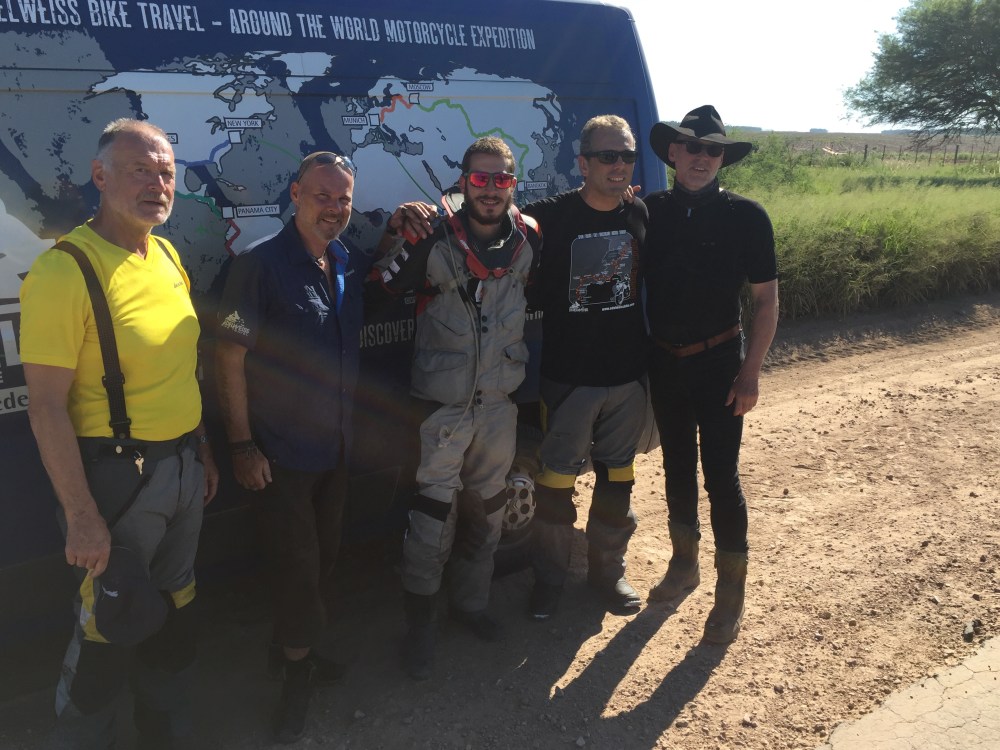 Mientras estaba en la trocha, me encontré con cinco europeos y un canadiense que están dándole la vuelta al mundo y tienen hasta carro de apoyo. A uno de ellos se le rompieron varios radios del rin de la moto y tuvieron que meterla en la van. Les di la info del taller en Tucumán y hablamos de las rutas un poco.