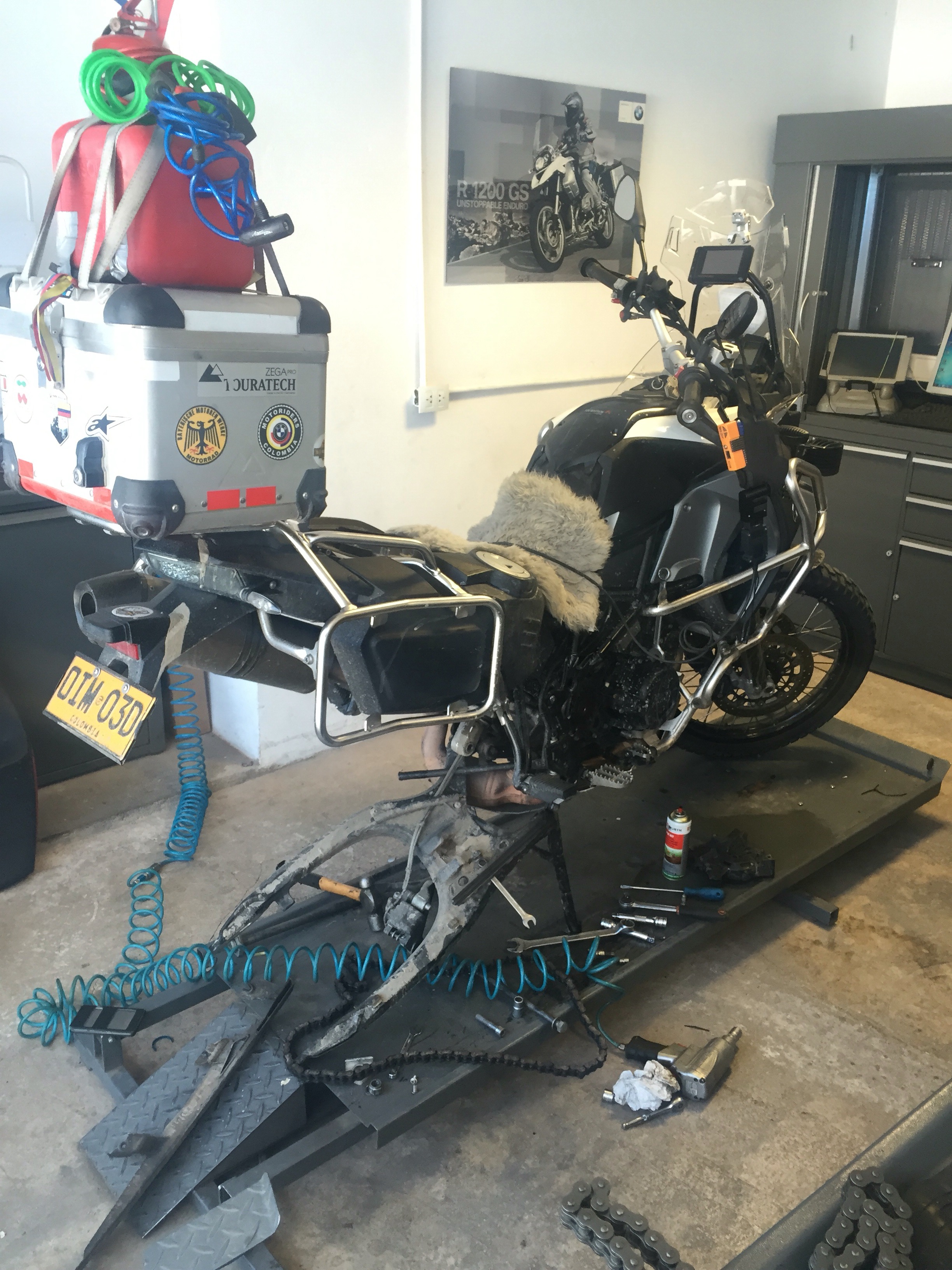 Llamé al taller de Tucumán gracias al man de la gasolinera que me prestó su celular. Nazareno prácticamente me dijo que era mi culpa, que no podía hacer nada porque yo estaba muy lejos, que manejar así era muy peligroso, que la garantía no iba a cubrir eso. Le respondí que no era posible que una moto 2015 sufriera de suspensión, que el día anterior le había pagado casi $500 USD para que le hiciera la revisión de 20 mil km y me entregó la moto jodida… Se supone que la conectan a un computador, revisan toda, y ahora le pasa esto… Muy raro, vean la foto del día anterior y juzguen por ustedes mismos: