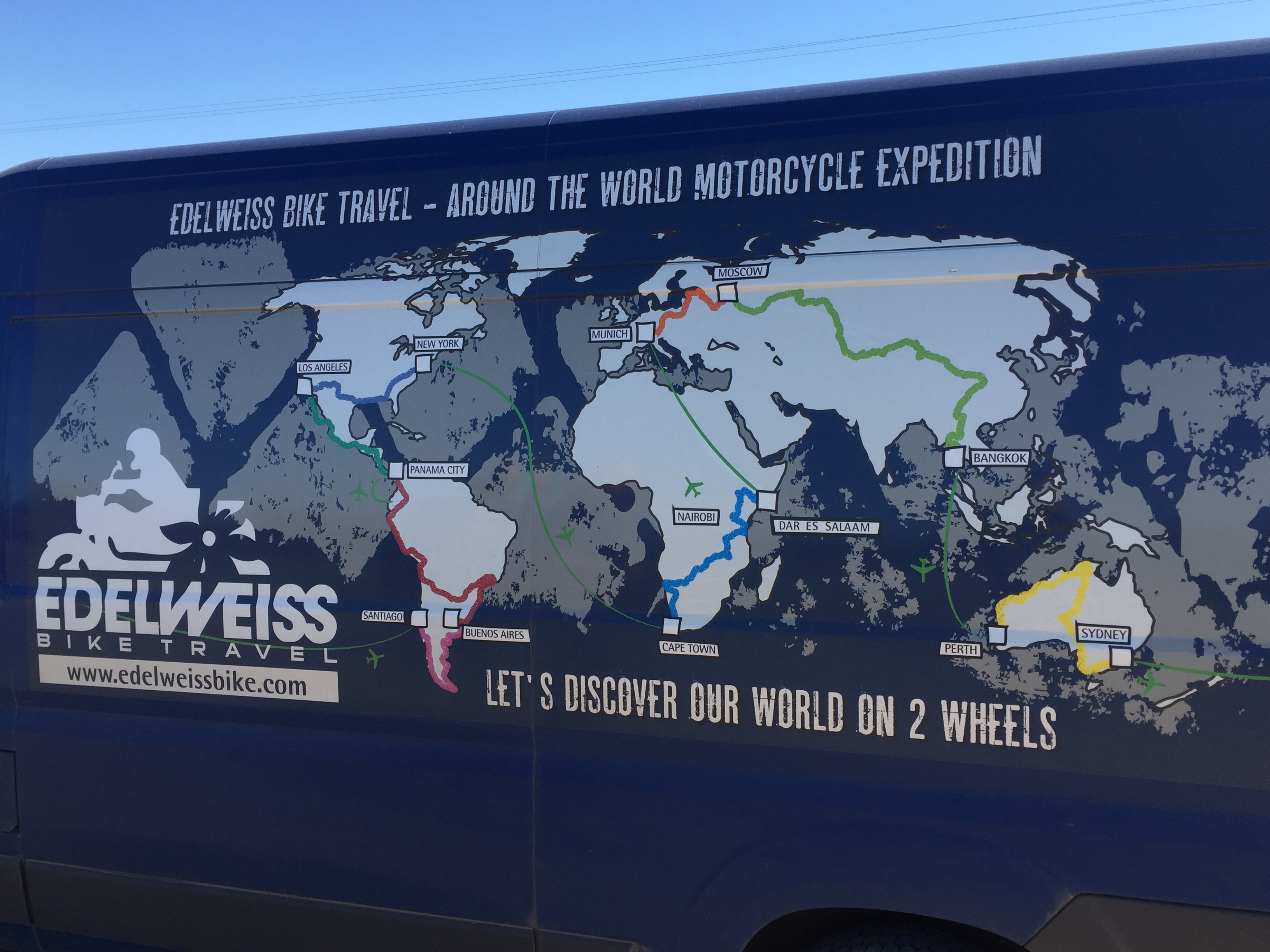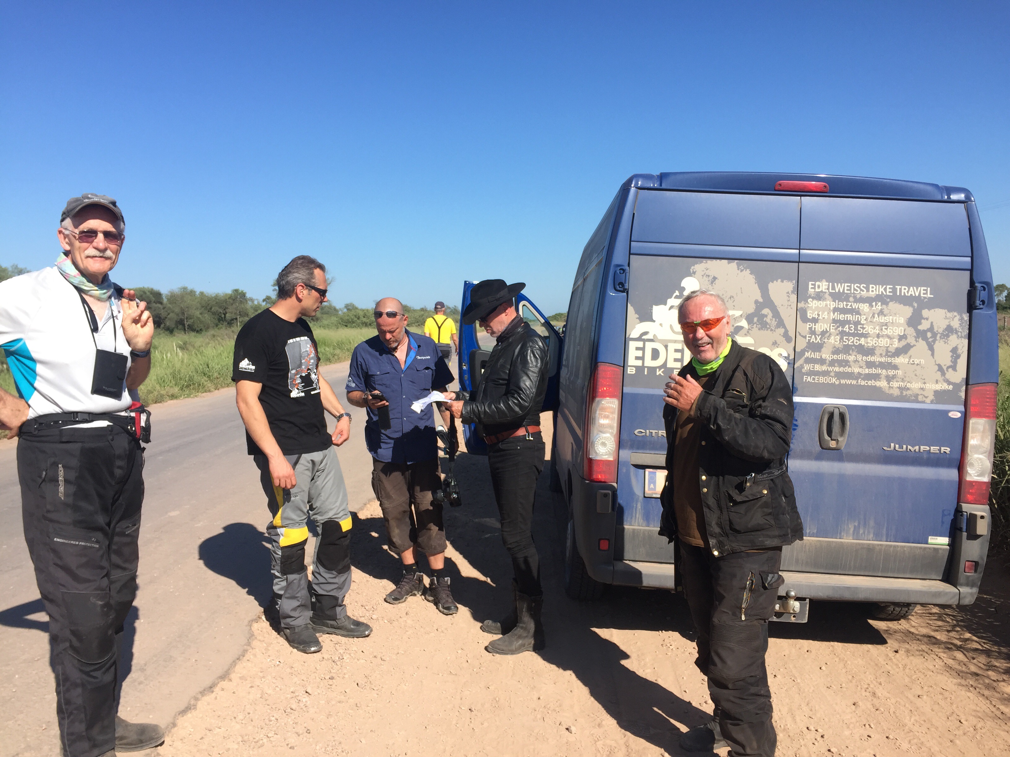 Mientras estaba en la trocha, me encontré con cinco europeos y un canadiense que están dándole la vuelta al mundo y tienen hasta carro de apoyo. A uno de ellos se le rompieron varios radios del rin de la moto y tuvieron que meterla en la van. Les di la info del taller en Tucumán y hablamos de las rutas un poco.
