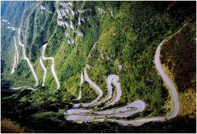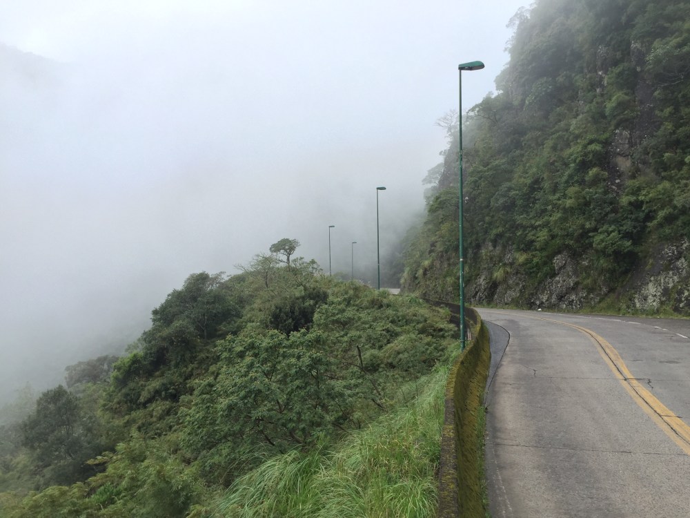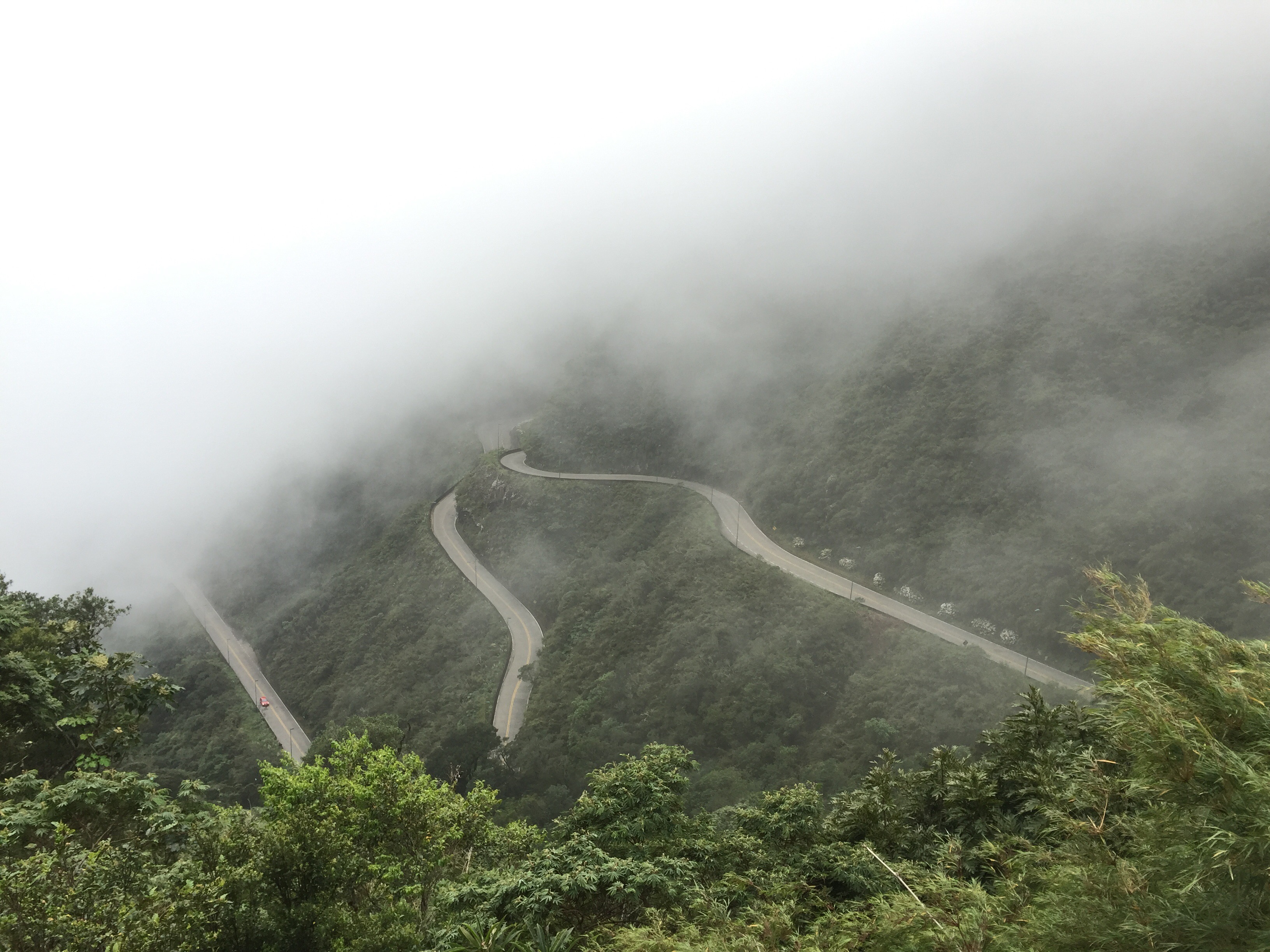 La ruta está tan buena, que la hice tres veces (dos de bajada y una de subida). Son 250 curvas en 12 km (curva cada 48 metros algunas de 180*). En total me hice 750 curvas, creo que ya obtuve el certificado en curvas… Como a mitad de camino, ya no había neblina; uno baja de 1,500 a 400 msnm en unos cuantos minutos, juzguen Uds: