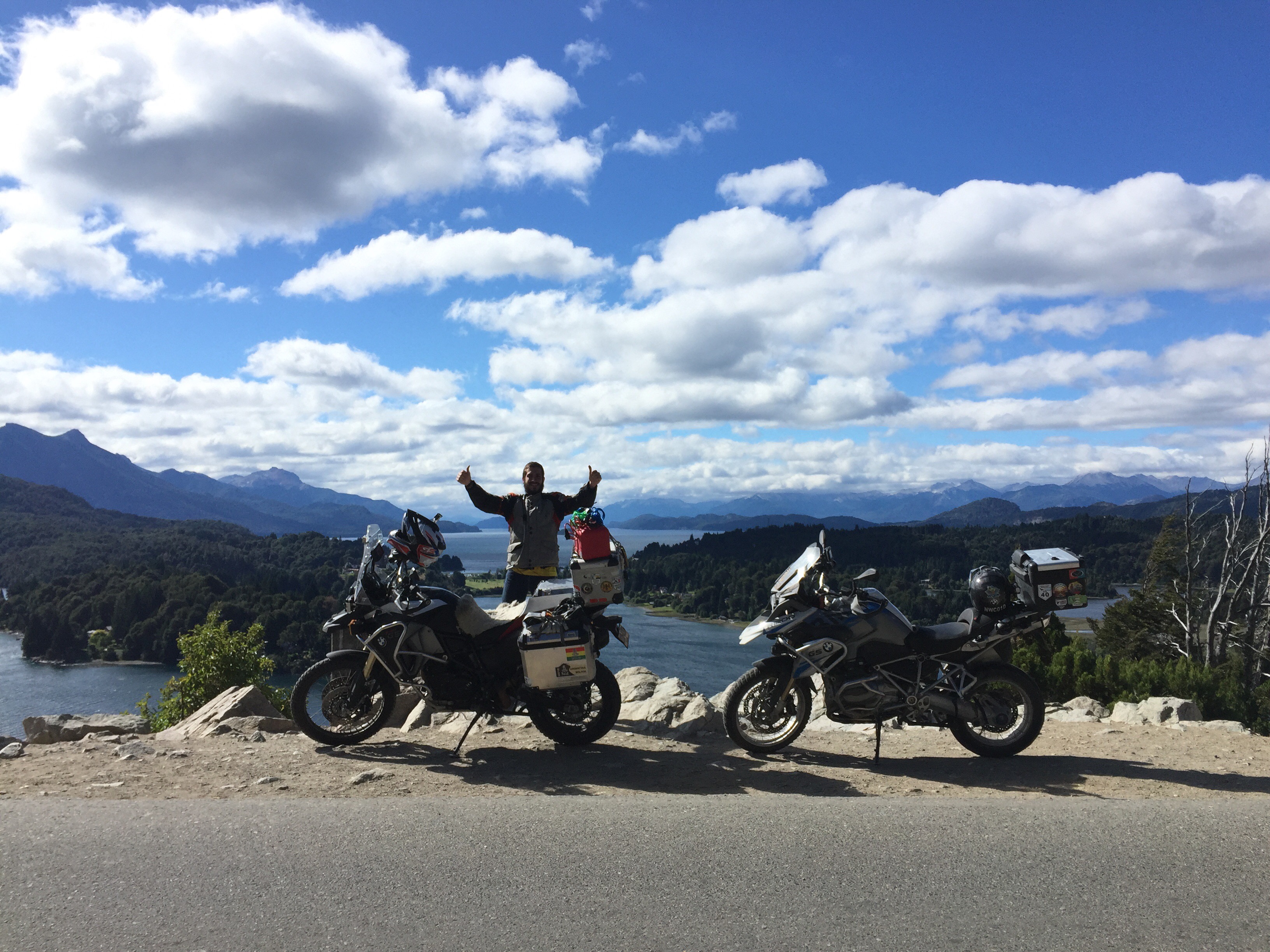 De ahí fuimos a darle una vuelta a «la colonia» que no tenía nada, eran como 15 casas y una feria artesanal. Cuando estábamos saliendo a hacer el Circuito Chico, se me atravesó un perro y al frenar, quedé en un desnivel en el que no pude poner el pie derecho… Al ver que ya no podía salvar la moto de la caída, la solté… Es preferible eso a joderme la rodilla. Primer y espero que última caida del viaje…