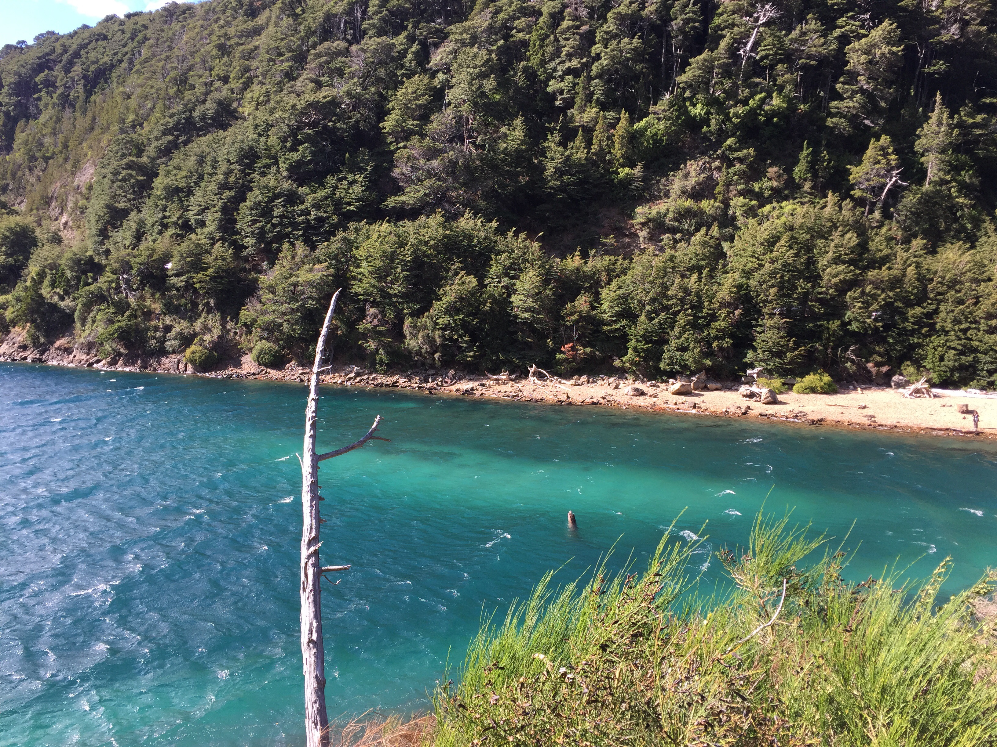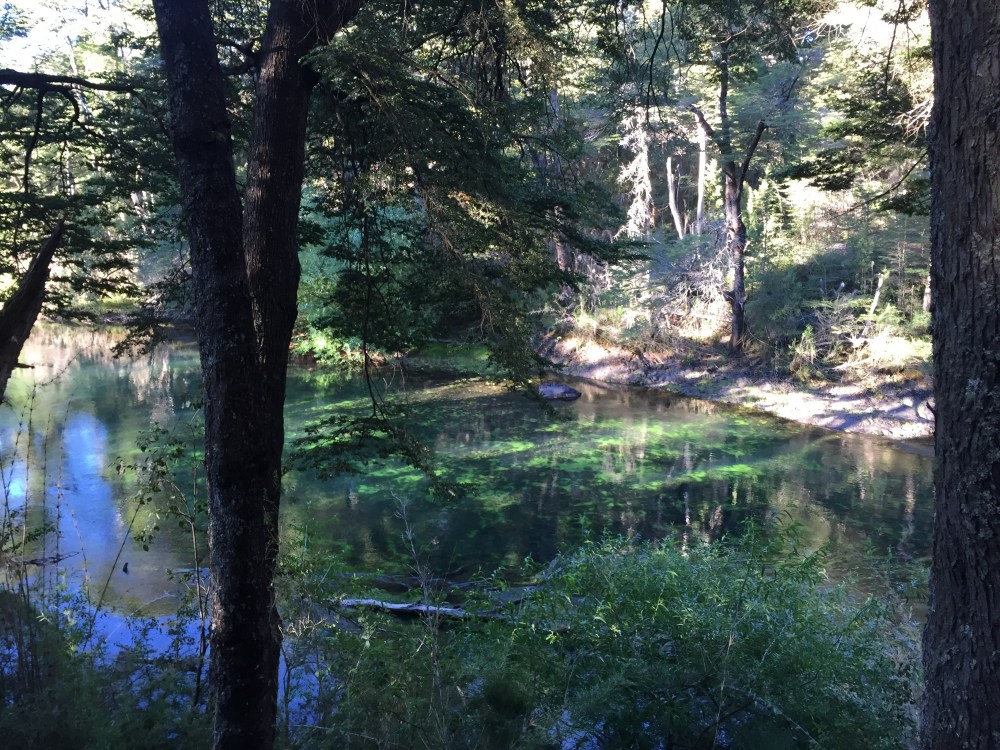 De bajada paramos en el río y tomamos agua (como todos los que iban bajando, además, me dijeron que de Bariloche para abajo se puede tomar agua de los ríos tranquilamente. A mí me quedan dudas acerca de eso, pero en este me animé al ver a todo el mundo envasando agua).
