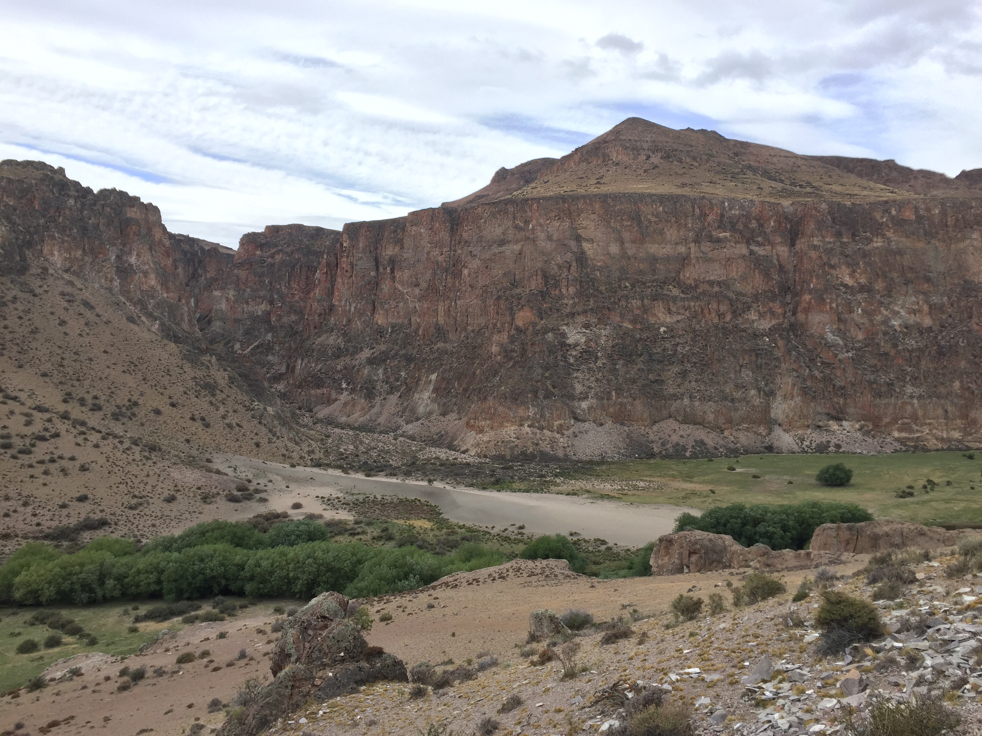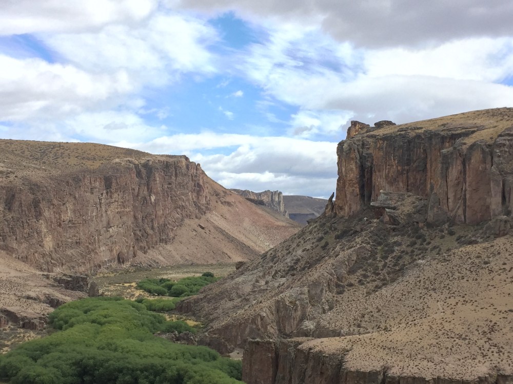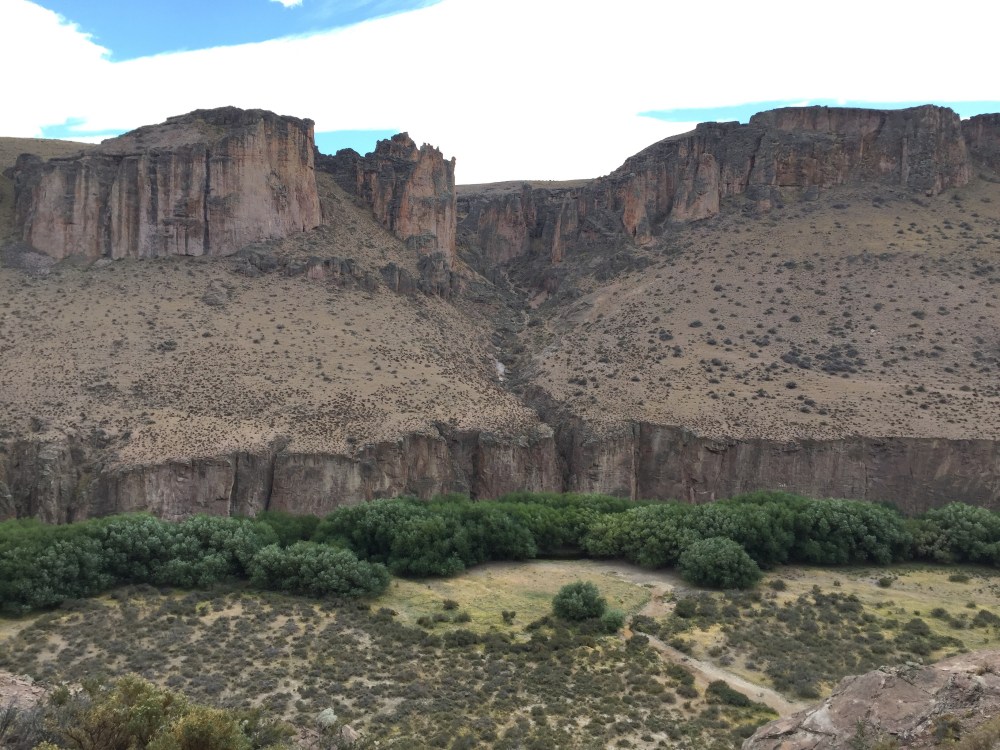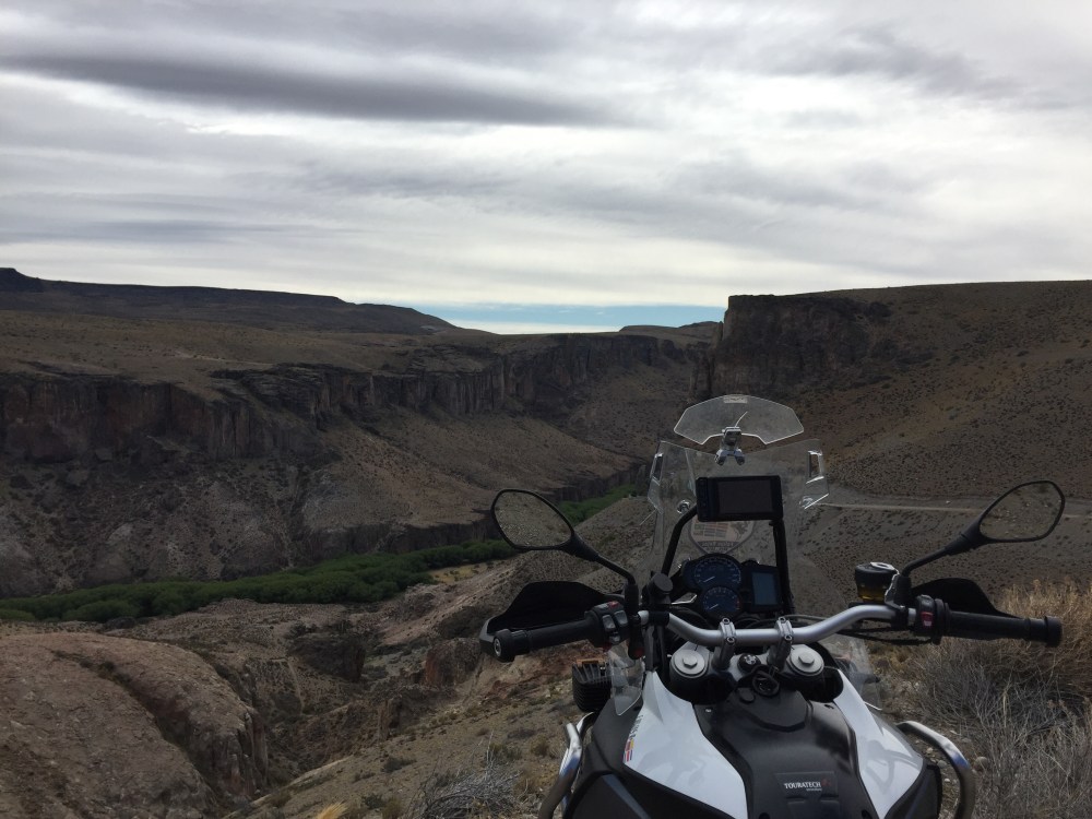 En Argentina el check-out es a las 10:00 a.m. (primera vez que me toca algo así). A esa hora ya estábamos camino a la Cueva de las Manos (a 110 km de Perito Moreno). Apenas salimos, ya empezamos a sentir el viento, que lo obliga a uno a ir con la moto de lado, algo así: \\\\\ (pega mucho del este). Llegando al desvío para la cueva, en una curva, sale una bandada que por el fuerte viento hace que avancen más lento, infortunadamente, el último pájaro no me lo pude esquivar y le pegué con el casco… Vi por el retrovisor como cayó a la vía…