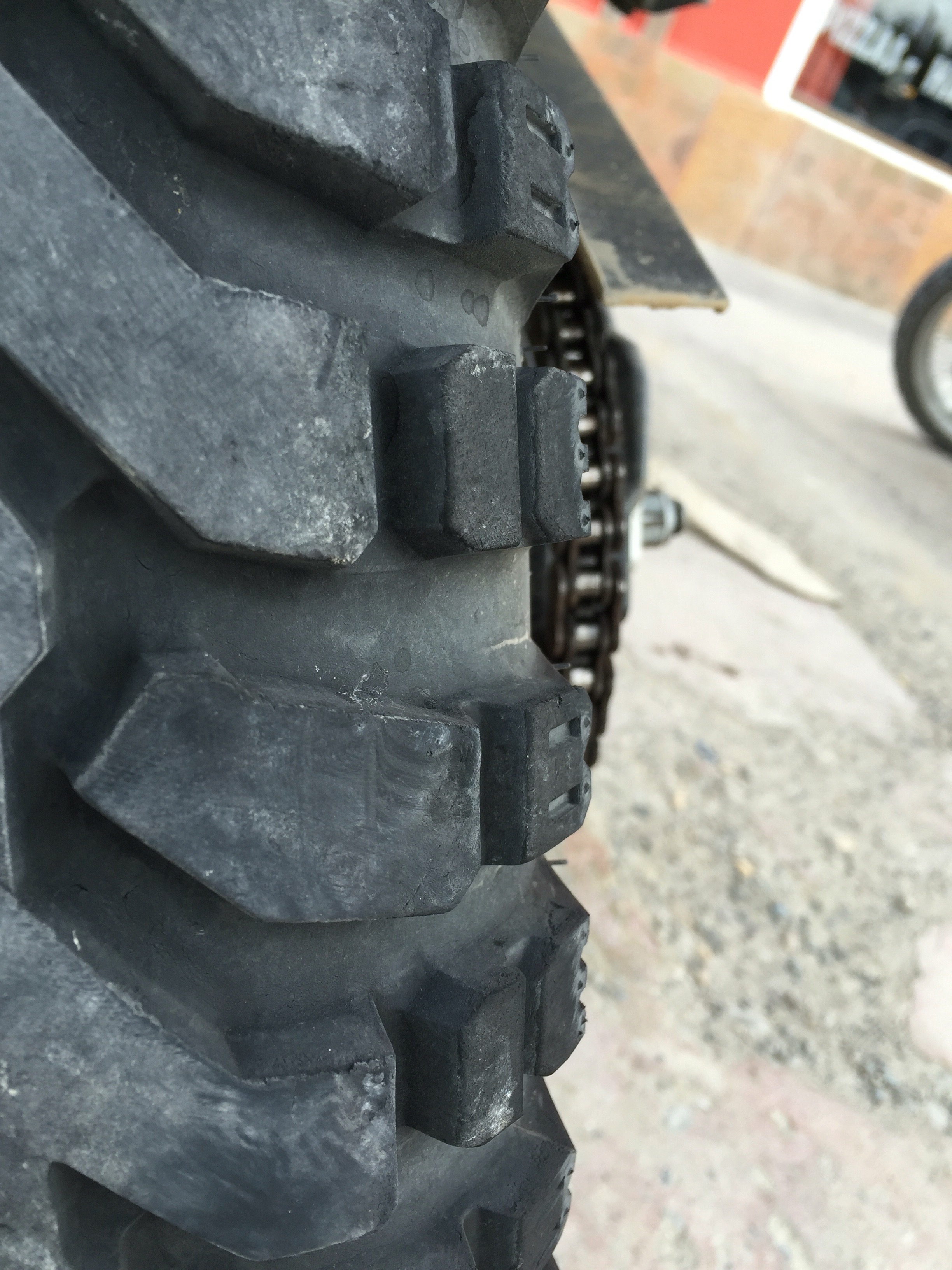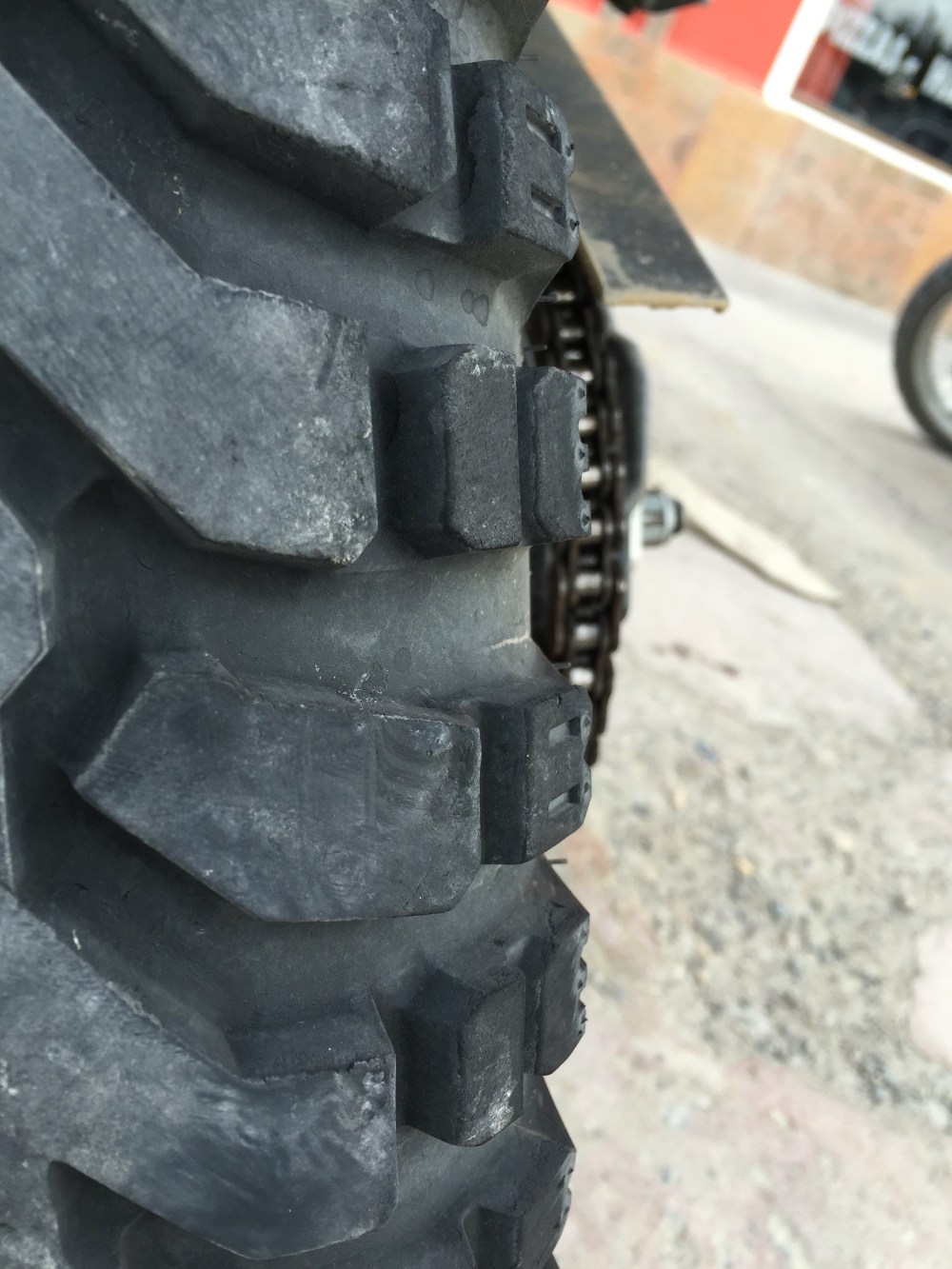Acá en las fotos pueden ver cómo se desgastó más el lado derecho de la llanta, por contrarrestar la fuerza del viento e ir con la moto «acostada»: