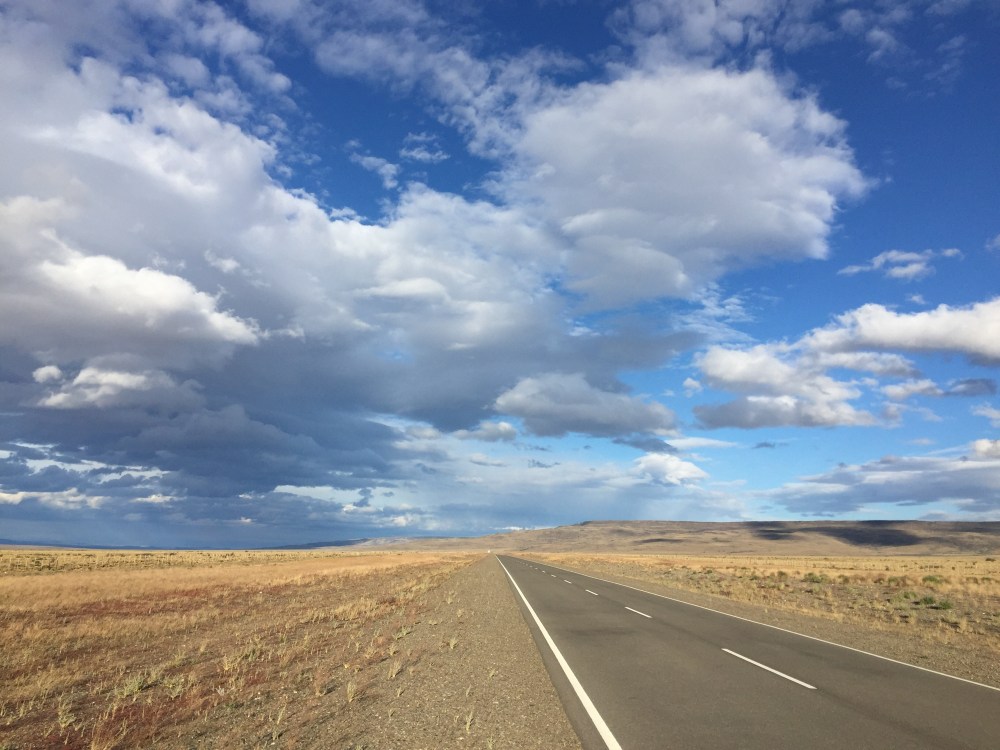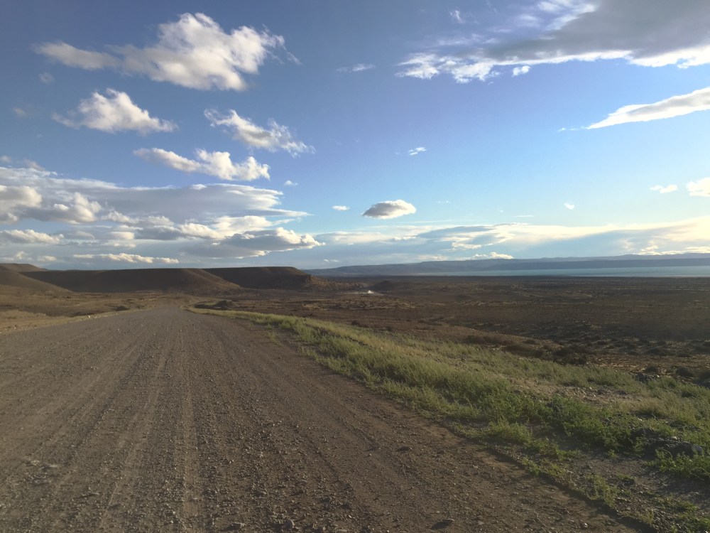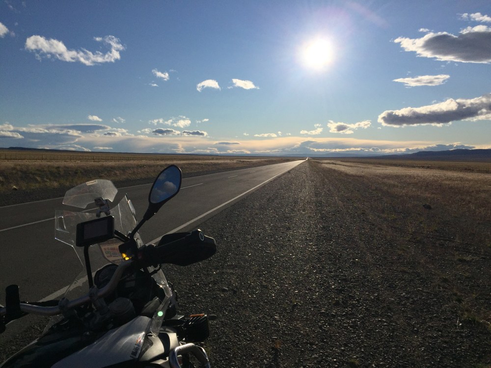 Después de la trocha, nos cogió la noche en plena carretera, cuando tomamos la vía a El Chaltén, todo el viento nos tocó de frente, durante 90 km… Nunca había sentido tanto frío como esa noche… Les juro que en varios momentos pensé en parar y tirar la moto a la mierda, pero sólo quería llegar lo más pronto posible (los dedos de las manos y pies no los sentía, las piernas me temblaban… Eso que iba con liner y el termómetro marcaba 6.5*C, pero de acá para abajo me pongo la ropa térmica porque ese viento helado es muy hp).