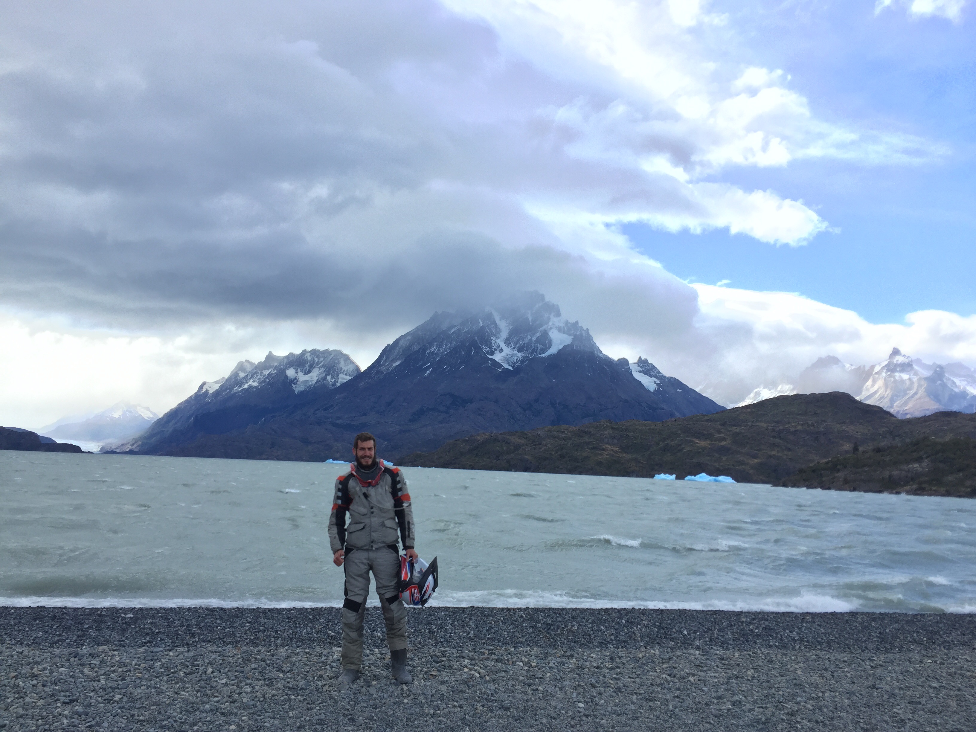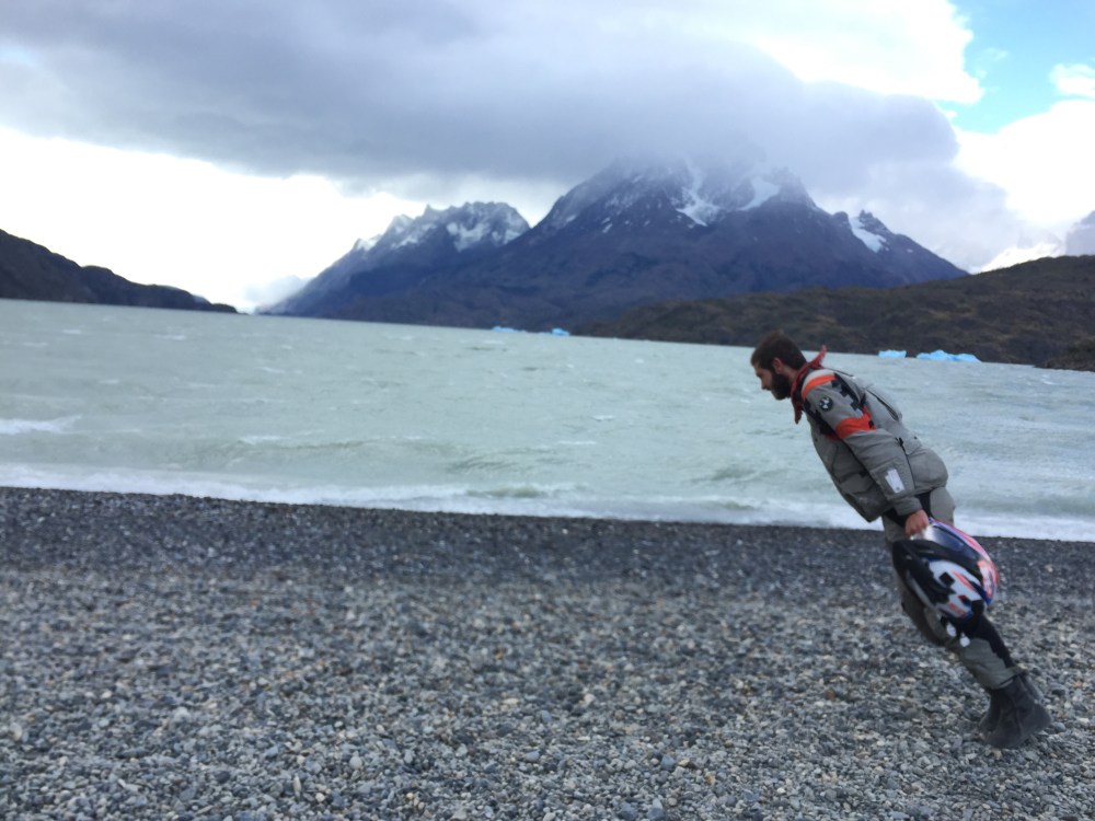 Nos fuimos a ver el Lago Grey y desde que salimos de la portería, la trocha era con mucha piedra suelta y el viento nos empezó a dar duro, nos tiraba de un lado de la vía para el otro y esa moto era en puro perreo moviéndose por falta de agarre. Son como 25 km desde que uno se desvía, hasta el parqueadero. De ahí uno tiene que hacer una caminata como de 20 minutos, hasta llegar al lago, que está partido en dos y se hace una especie de playa. Ahí nos quedamos un rato molestando y tomándonos fotos aprovechando el viento.