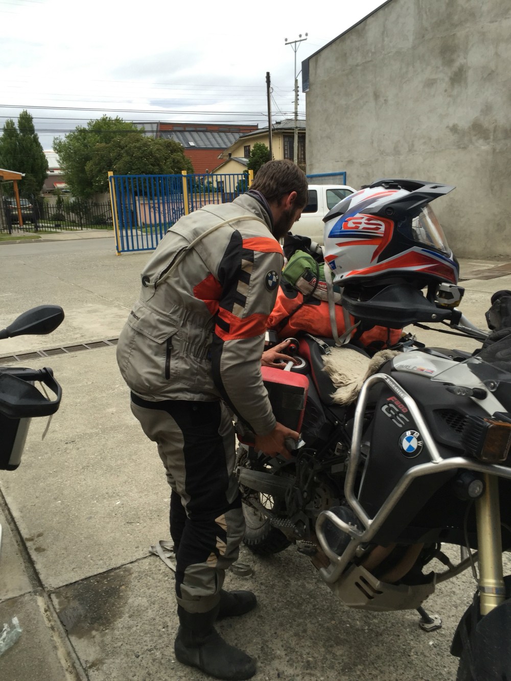 Cuando íbamos saliendo, Jady notó que la llanta de atrás, estaba en el piso. Fuimos a echarle aire y a calibrar las mías también, después aproveché pes tensionar la cadena otra vez. Hoy por fin voy a poder ponerle una nueva en Punta Arenas.
