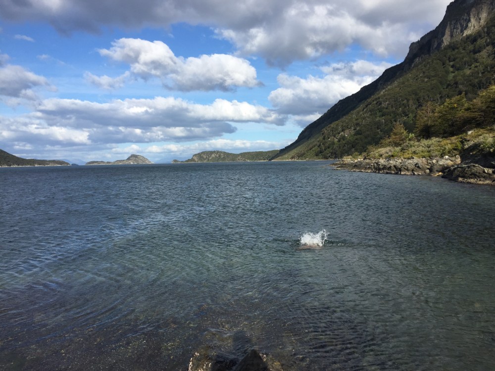 Estuve ahí unos minutos (no muchos obviamente), mientras tomábamos las fotos, pero claramente, de la cintura para abajo. Me hundí un par de veces y para afuera (el agua estaba demasiado salada, tan salada que la boca te picaba y podías sentir la sal aún sin haber abierto la boca, además del fuerte olor a algas). Cuando salí, tenía las piernas rojas y las manos no me respondían bien. Me sequé, y me puse la ropa térmica y después seguía Jady… Las fotos para el parcero y listo, a ponerse el traje de la moto y arrancar para el hostal a bañarse con agua caliente.