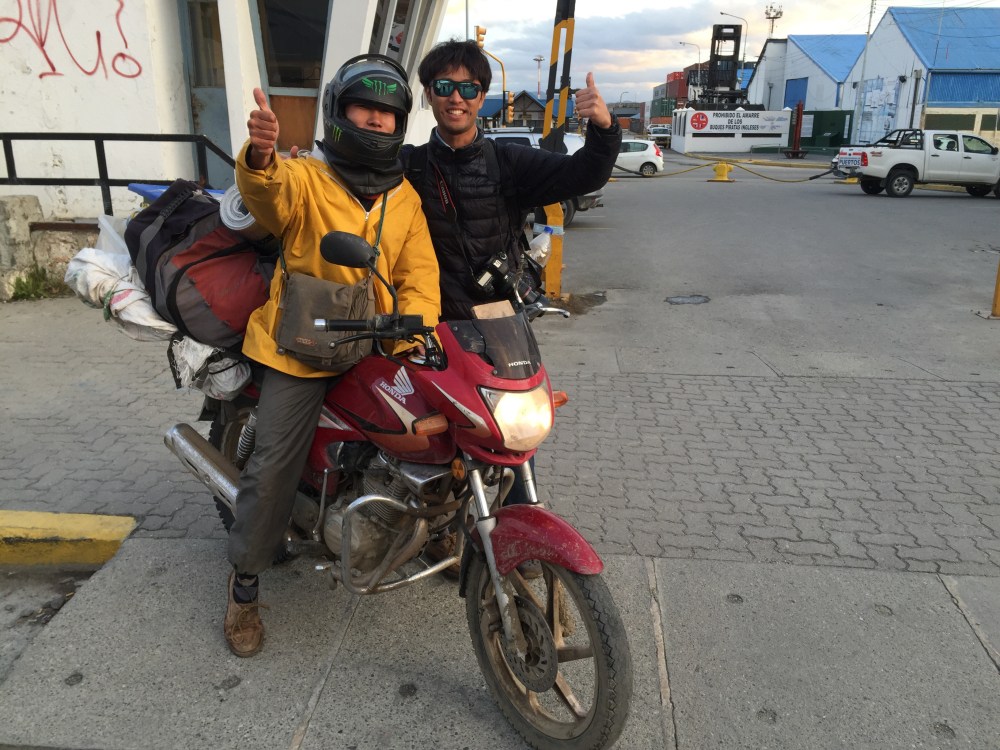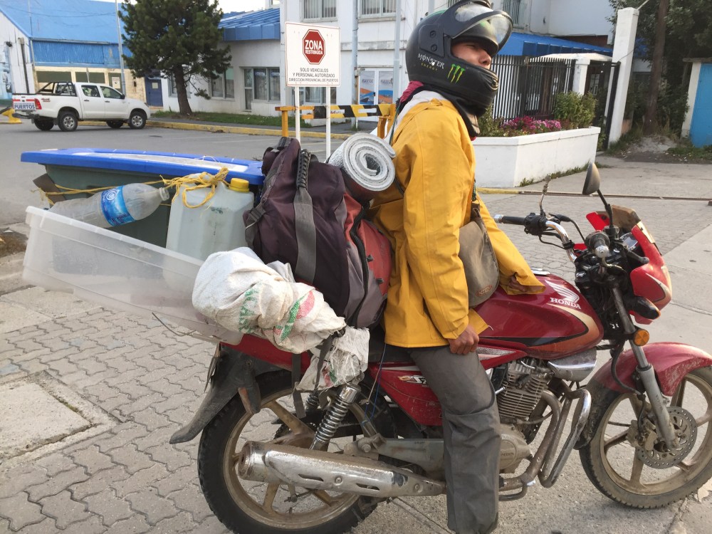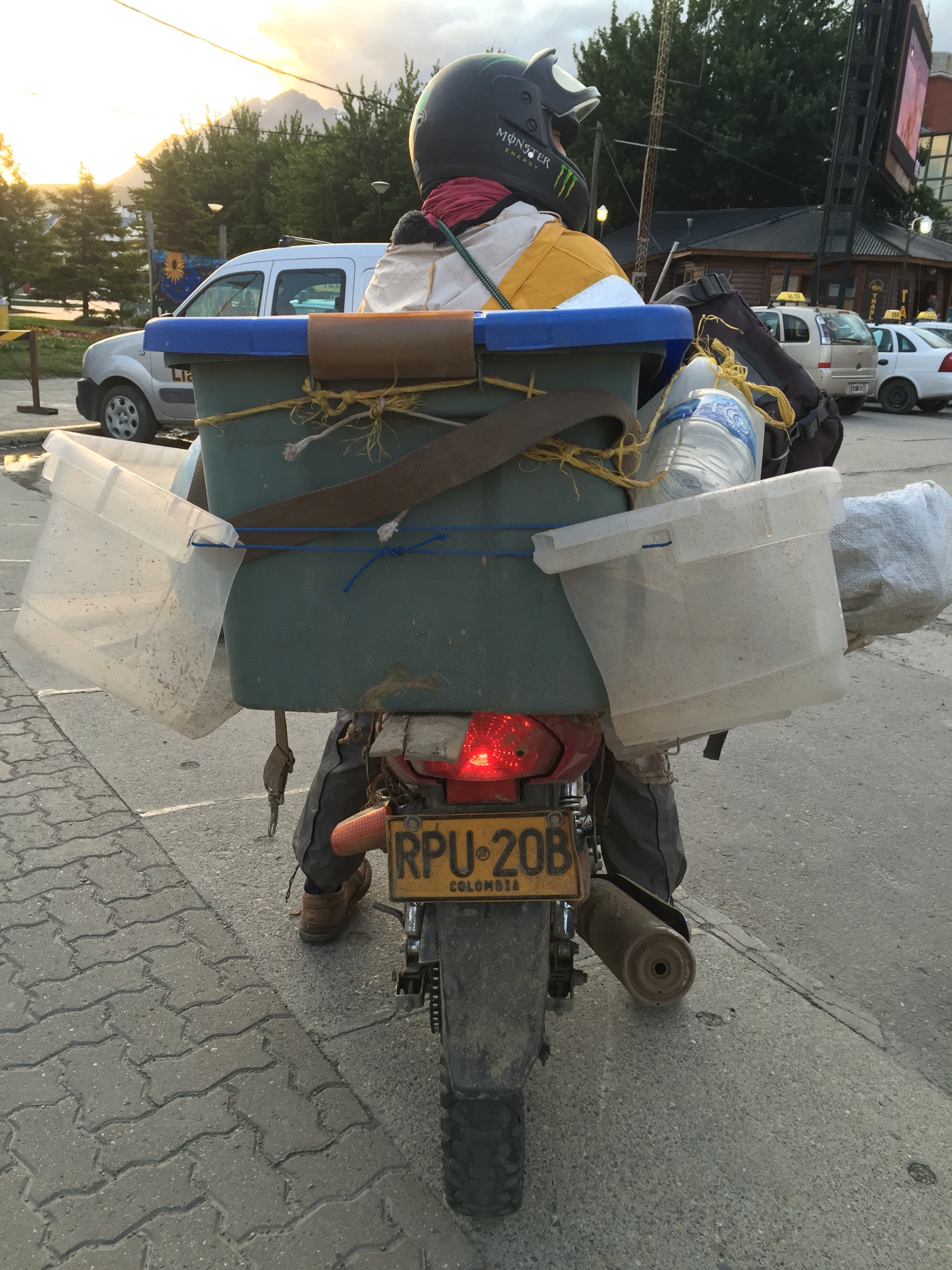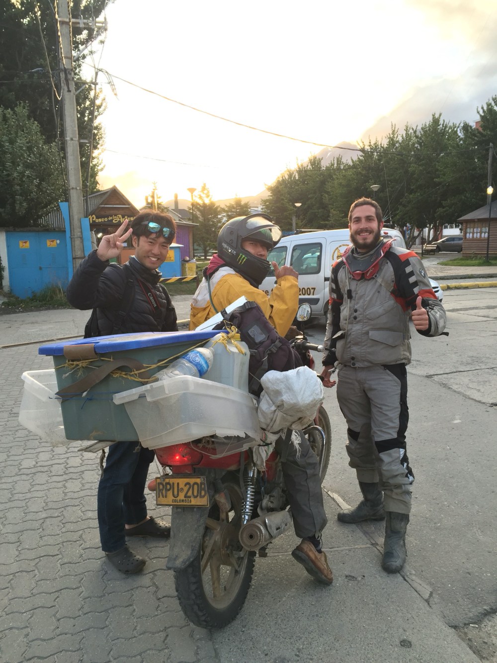 Hablamos un rato con el parcero y vimos a un chino (que en verdad era japonés, pero ¿a quién le vamos a mentir?, cada que vemos a un asiático, le decimos chino…), en una Honda con placa colombiana… Lo paré y le empecé a preguntar del viaje, me contó que lleva dos meses manejando, que va para la Antártica (obviamente en barco) y que esa moto la va a dejar tirada ahí en Ushuaia porque ya está acabada y cumplió con llevarlo.