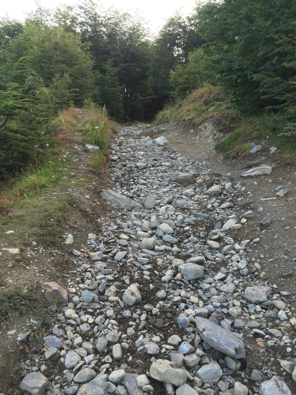 Salimos para el Glaciar Martial, donde tendríamos una excelente vista de la ciudad y del Canal Beagle, pero al llegar, había que hacer un trekking de 75 minutos y la verdad estamos mamados de caminar con el traje de la moto. Así que nos devolvimos y fuimos a organizar las motos para el recorrido de mañana. Cuando estábamos bajando, íbamos buscando algún mirador y nos metimos a una trocha «técnica» como diría un parcero: