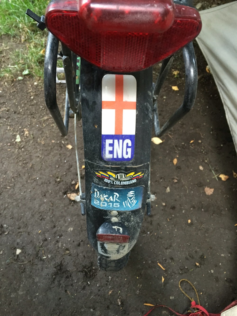 El man se llama Chris White, es un inglés del suroeste de la isla y lleva cuatro años viajando en bicicleta. Empezó en Nueva Zelanda y de ahí se fue a Canadá a hacer todo América. Le encantó Colombia y en su bicicleta tiene como tres calcomanías más de mi país, incluyendo una de Juan Valdez (el famoso café colombiano).