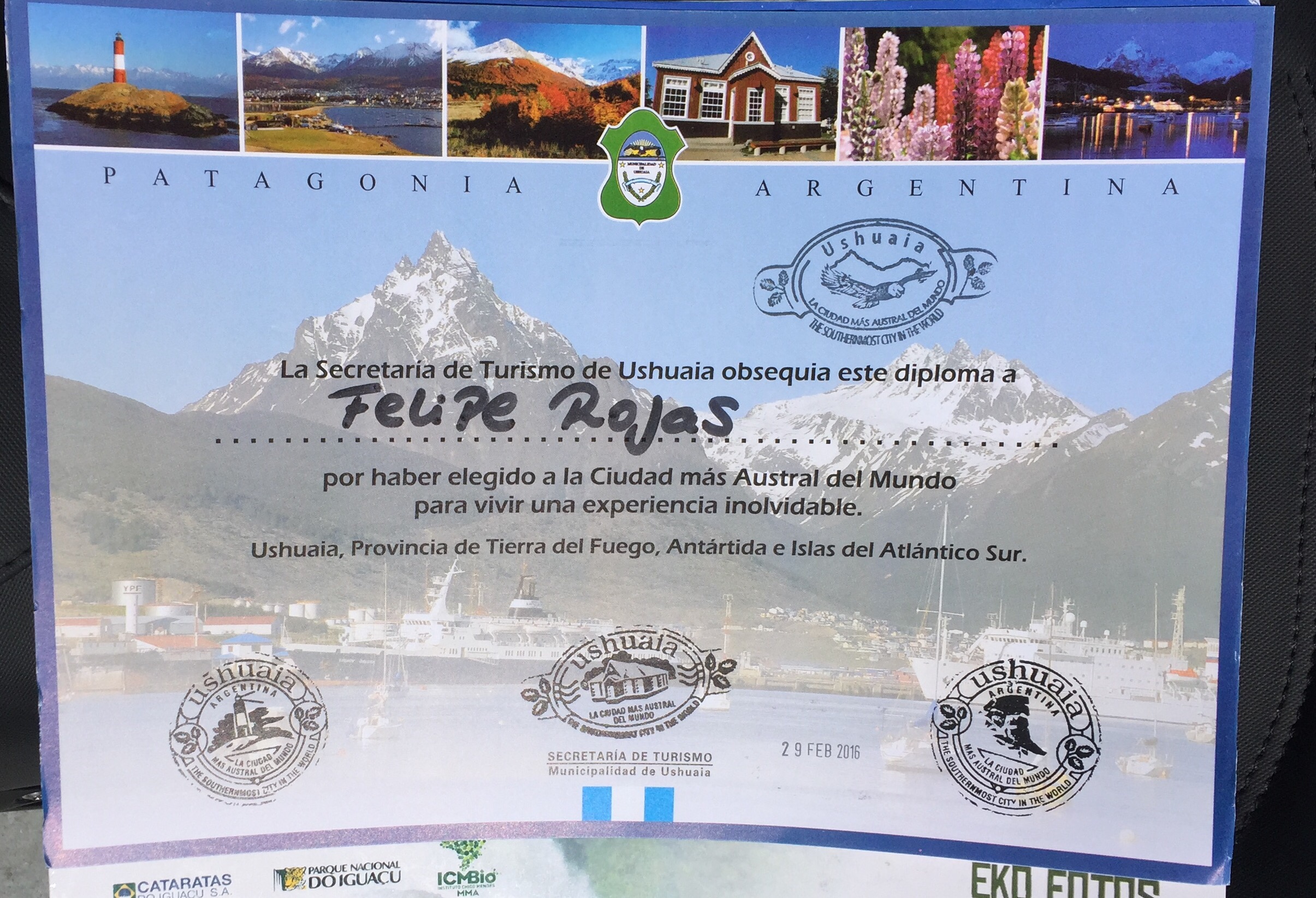 Después nos fuimos para la oficina de turismo de Ushuaia a que nos dieran un certificado por haber llegado a la ciudad más austral del mundo. La oficina queda al lado del puerto y cerca al letrero de Ushuaia, en avenida Maipú con Lasserre. De ahí fuimos a un pasaje artesanal, al frente de la oficina de turismo y después a tomar estas fotos (todo queda cerca y se puede caminar):