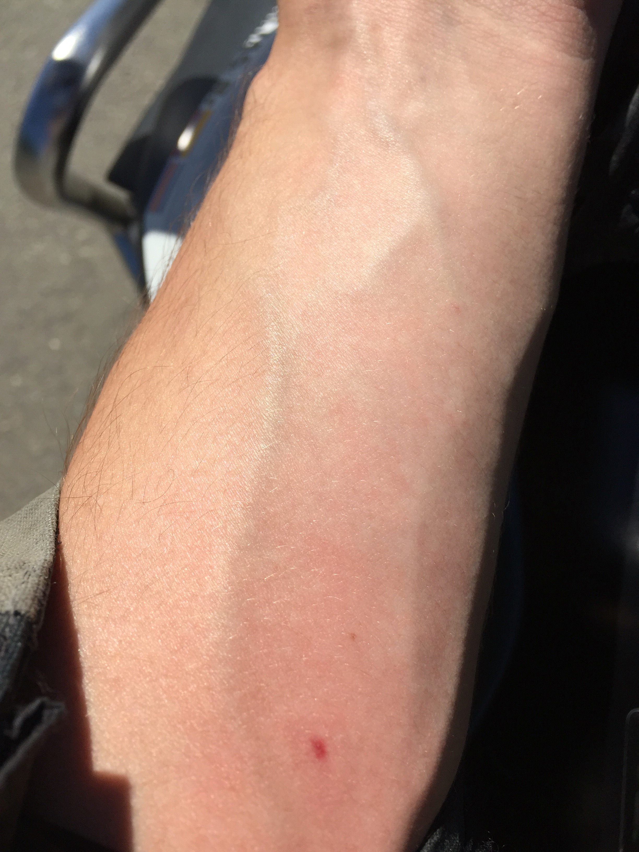 La ruta 5 chilena es una belleza, doble carril, velocidad máxima de 120, en perfecto estado. Son tres peajes hasta Temuco. Me voy bien soyado con música electrónica, cuando de la nada siento un ardor ni el hp en el antebrazo izquierdo… Ay marica, algo me está picando… Me tocó golpearme el brazo contra la rodilla, para matar lo que fuera que me estaba picsndo, mientras desaceleraba y me metía a la berma…