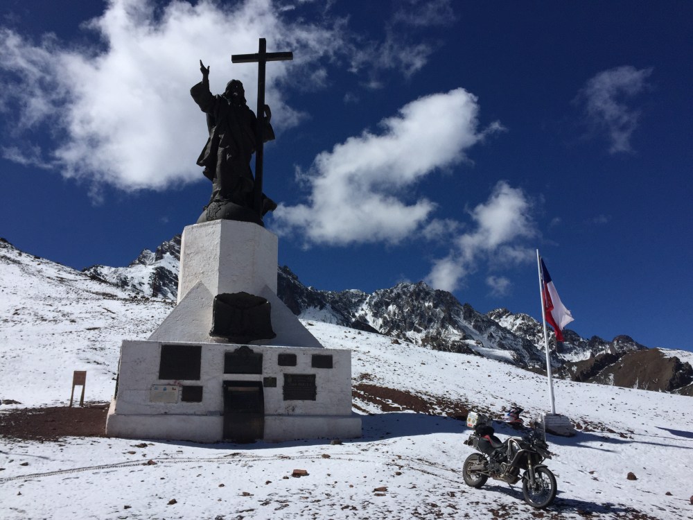 Antes del túnel, veo un letrero que dice «Cristo Redentor de los Andes». Algo había escuchado, pero no sabía cómo era la cosa, así que me metí por la trocha que es la versión en carretera destapada, de los caracoles que había hecho recientemente. Para mi sorpresa, había nieve… Por fin manejaba la moto en nieve… Me entró una felicidad porque hace rato quería hacerlo.