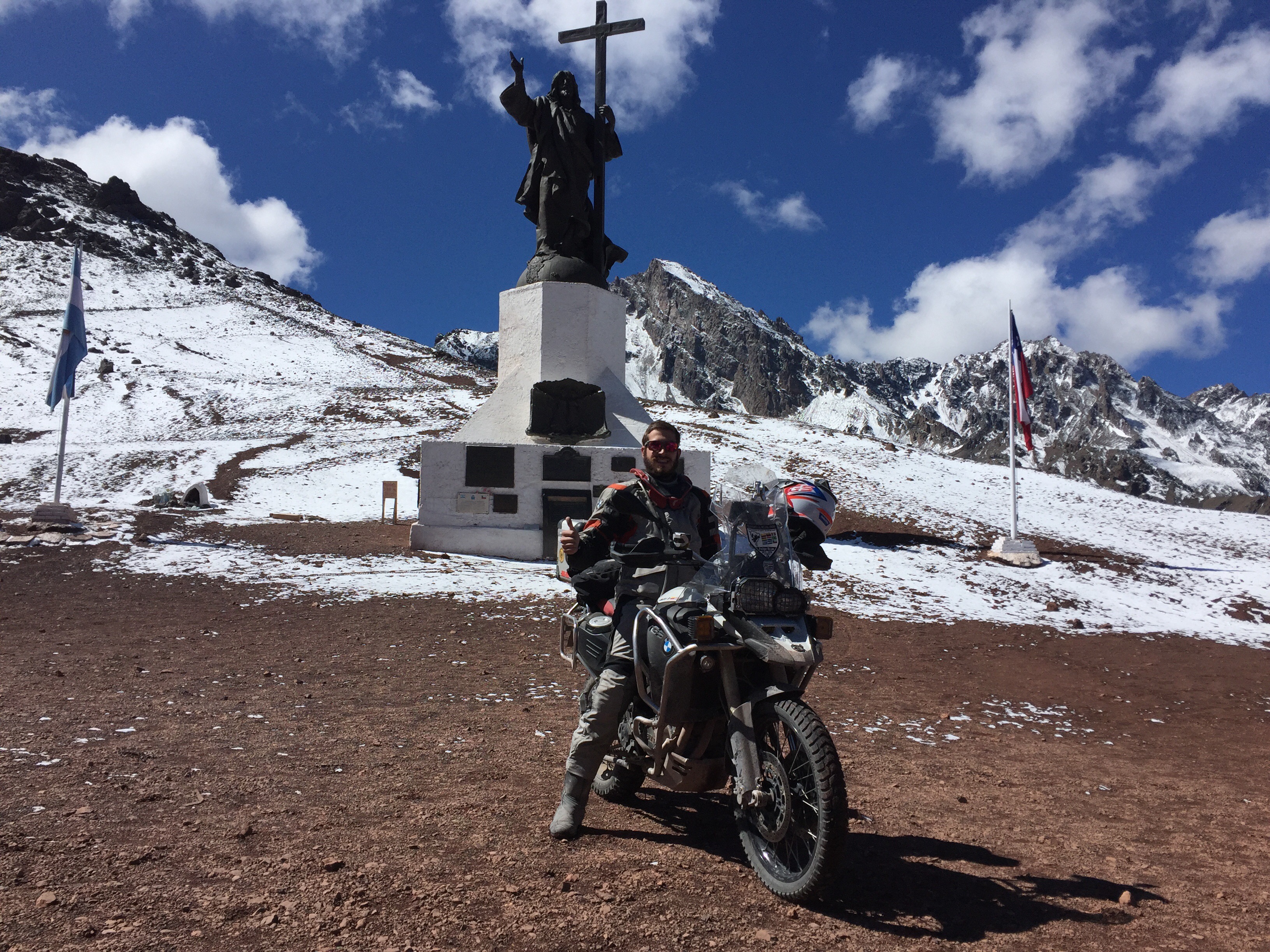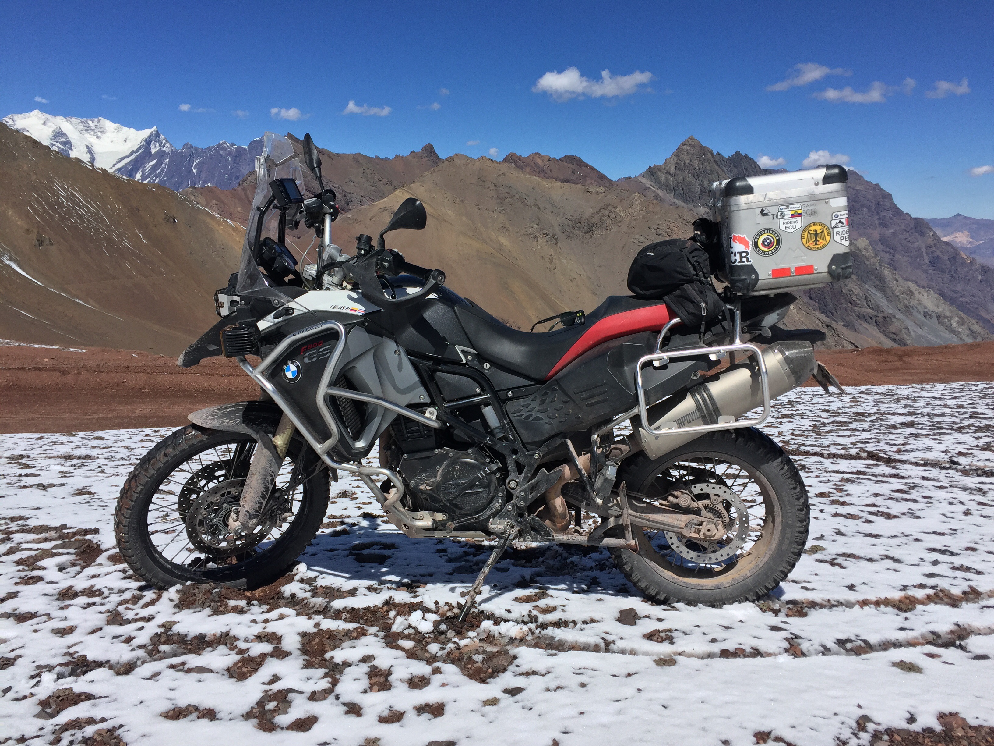 Le pregunté a un argentino, cuál era la estación de servicio más cercana, porque ya me estaba quedando sin gasolina y no había echado en Chile, porque quiero gastarme los pesos argentinos que me quedan. Infortunadamente, la más cercana está a 80 km y me tocaría hacer frontera y aduanas para poder tanquear. Como no vine con maletas, tampoco traje el bidón… Me toca jugarmela así… Bajo del Cristo por el lado argentino (subí por el chileno), con la moto apagada porque necesito ahorrar lo más que pueda. La bajada era de 10 km (lo cual me da 20 km más, que son los diez que ya hice sin gastar gasolina, más diez que haría cuando tenga que prenderla). De ahí, hasta la entrada al cerro Aconcagua, voy apagándola cuando puedo y prendiéndola sólo cuando es realmente necesario… Esto me pasa por tirarmela de avispado y creer que habría una YPF esperándome apenas entrara a Argentina.