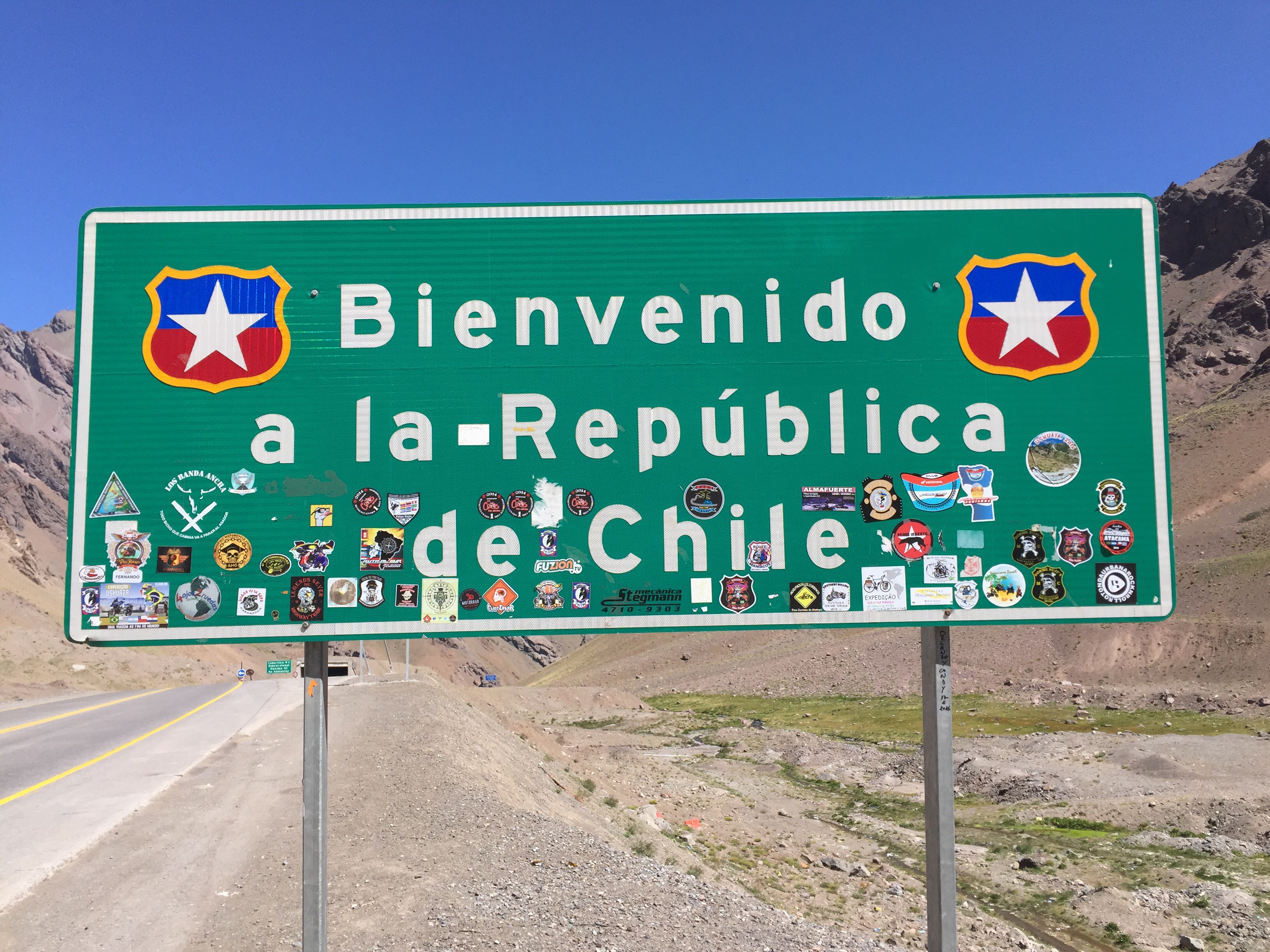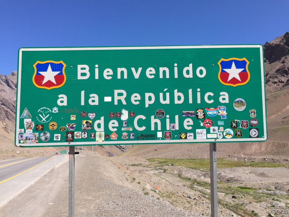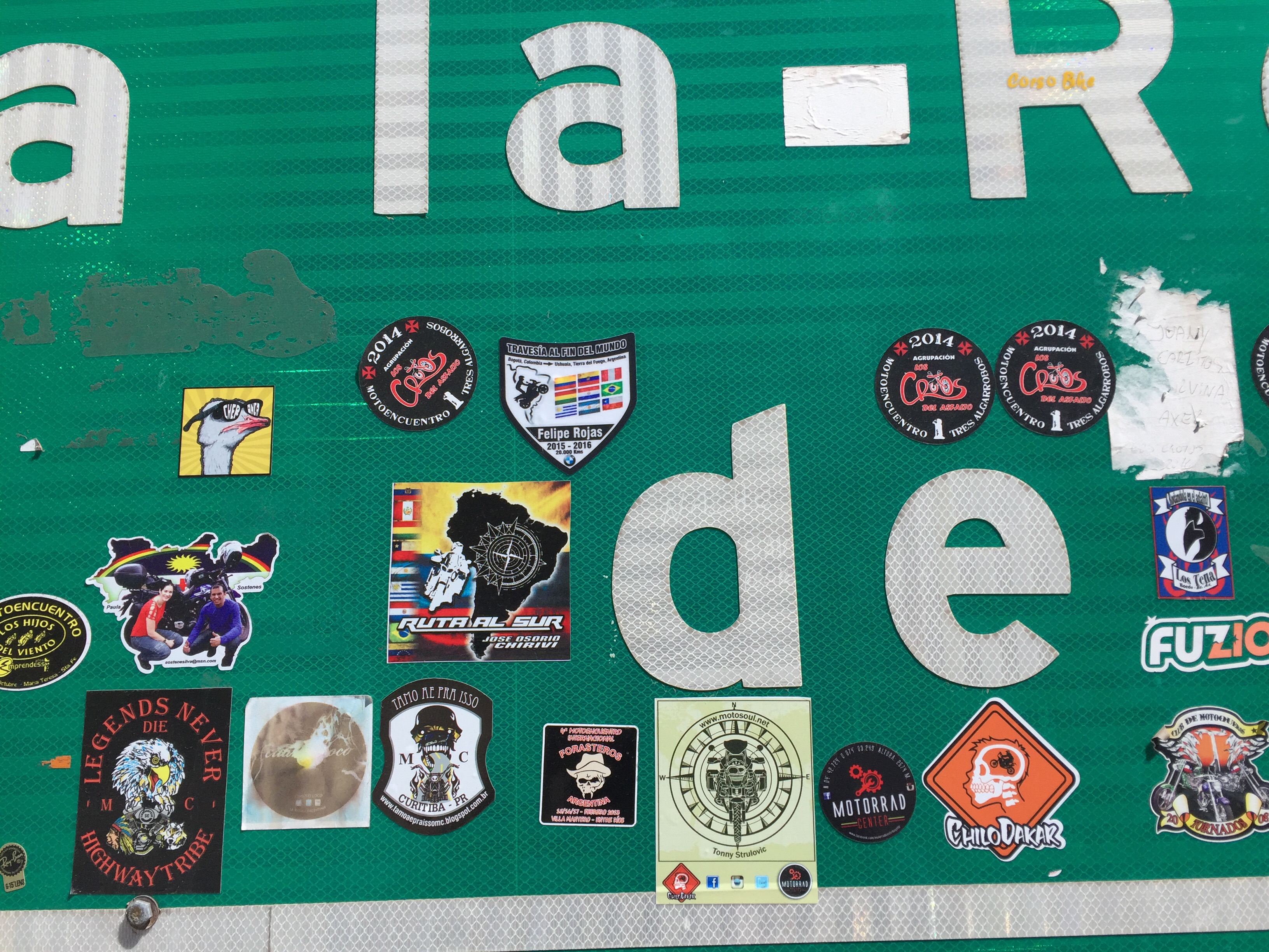 Me voy a almorzar a Las Cuevas (restaurantes y hostales que están apenas se baja del Cristo) y de ahí me devuelvo por el túnel del Cristo Redentor… Cuando uno lo está cruzando, a mitad de camino aparecen los letreros de buen viaje (Argentina) y el de bienvenidos (Chile). Cuando salgo de este, veo otro letrero en el que varios amigos han pegado sus calcomanías: