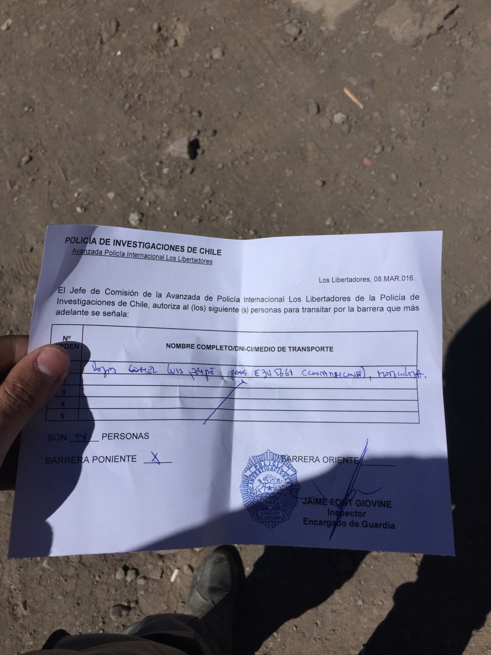 Cuando paso por la aduana chilena, les digo que yo no hice migración en Argentina, porque sólo fui hasta el Aconcagua (no llegué a Horcones que es el complejo binacional). Ahí me dicen que vaya a la oficina de la PDI (Policía de Investigaciones) y pida un PAX que es un permiso para poder pasar (cuando uno no hace migración y sólo va a el Cristo y Aconcagua)