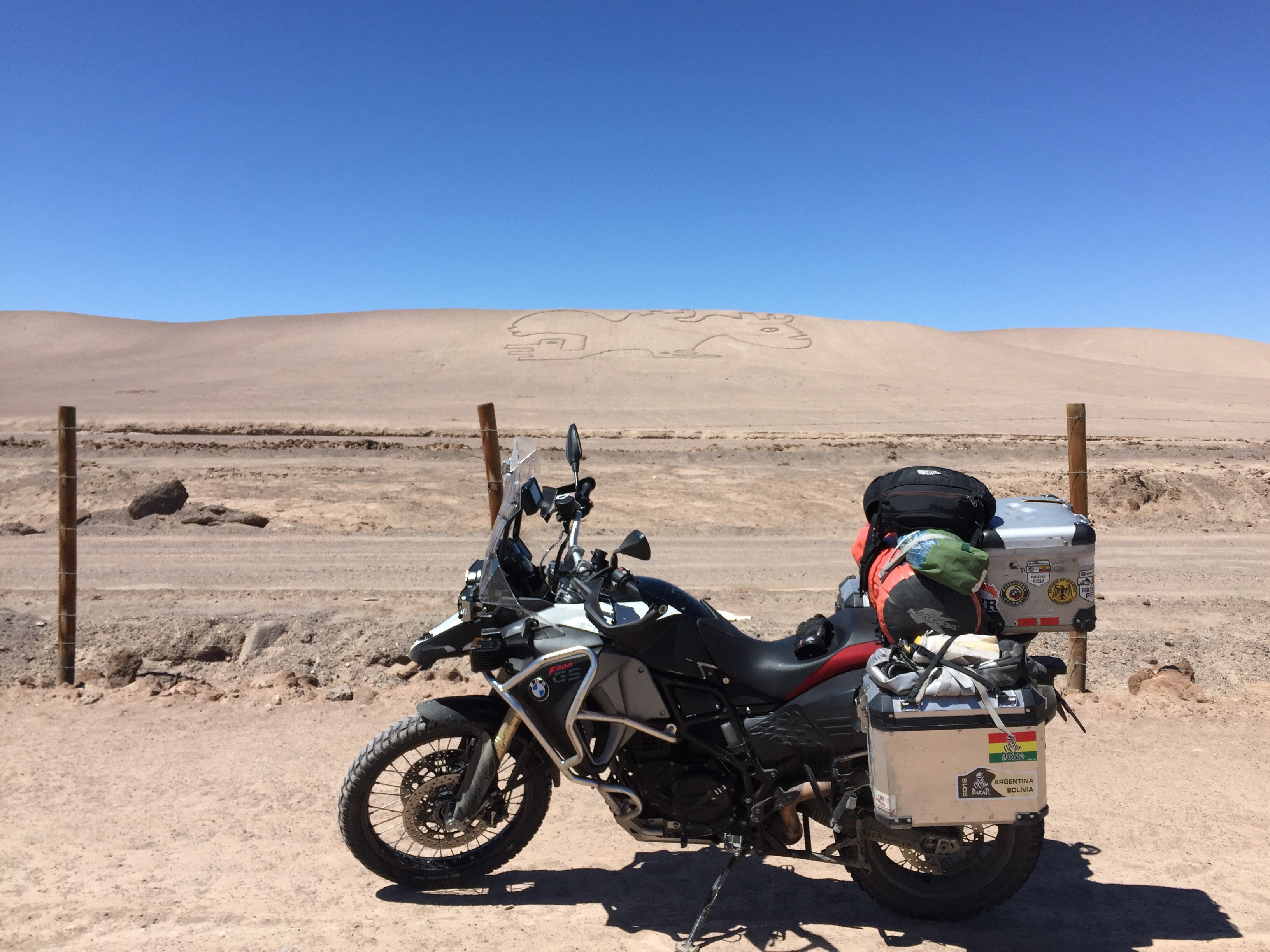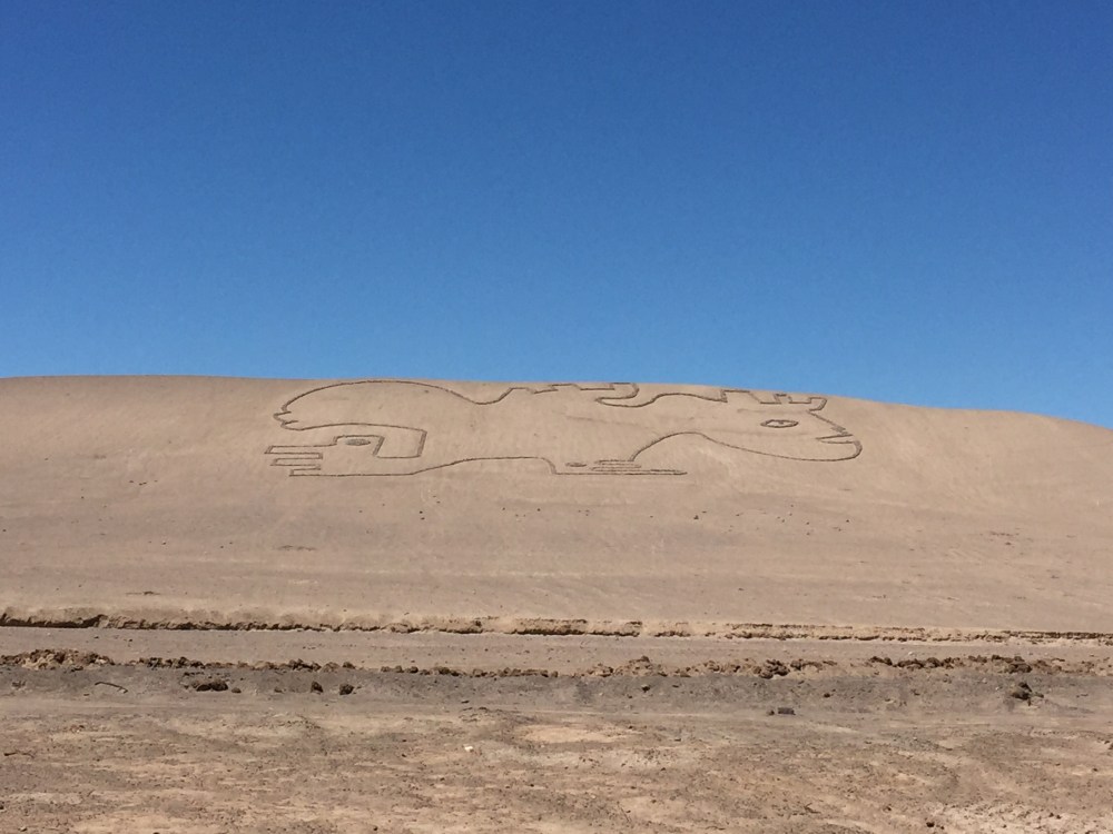 Voy elevado con la música, cuando empiezo a ver unos letreros con cámaras, como indicando que hay un lugar para tomar fotos… Todo lo que veo es una mina al lado izquierdo… En el próximo, miro al lado izquierdo y no veo nada, entonces volteo al derecho y veo este geoglifo… Casi que frenó en seco… Me tocó devolverme unos metros y me encuentro con esto: