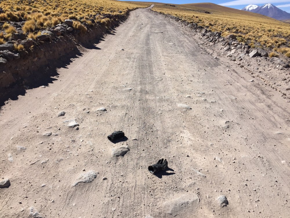 Como me bajé a tomar fotos, obviamente me quité los guantes, cuando me monté a la moto, no me los puse otra vez, sino que los dejé detrás del softbag… Sigo a tomar las siguientes fotos, cuando noto ir no estaban… Mierda, a devolverse en bombas para ver si alcanzo a recuperarlos… Afortunadamente aún seguían en la vía: