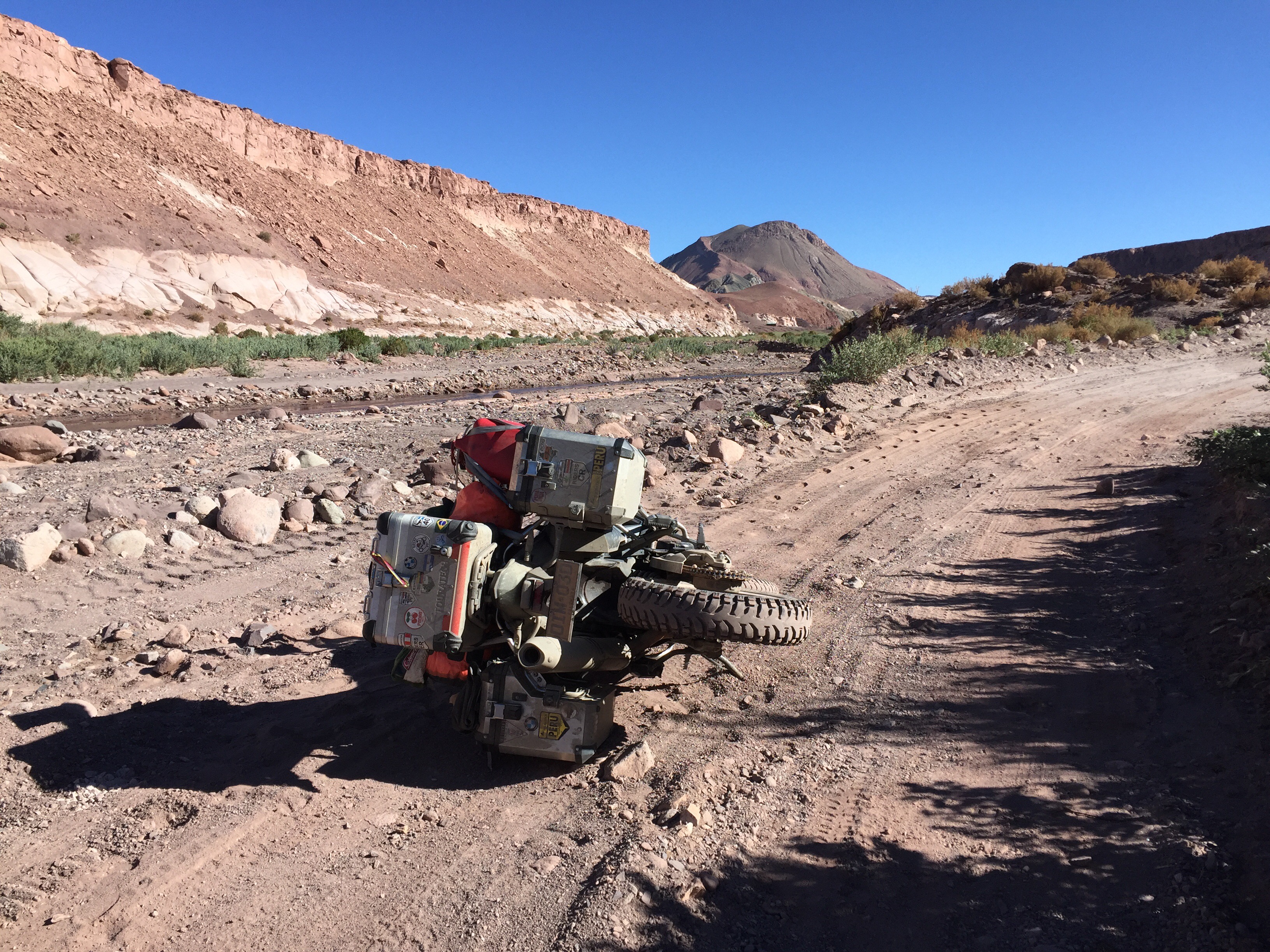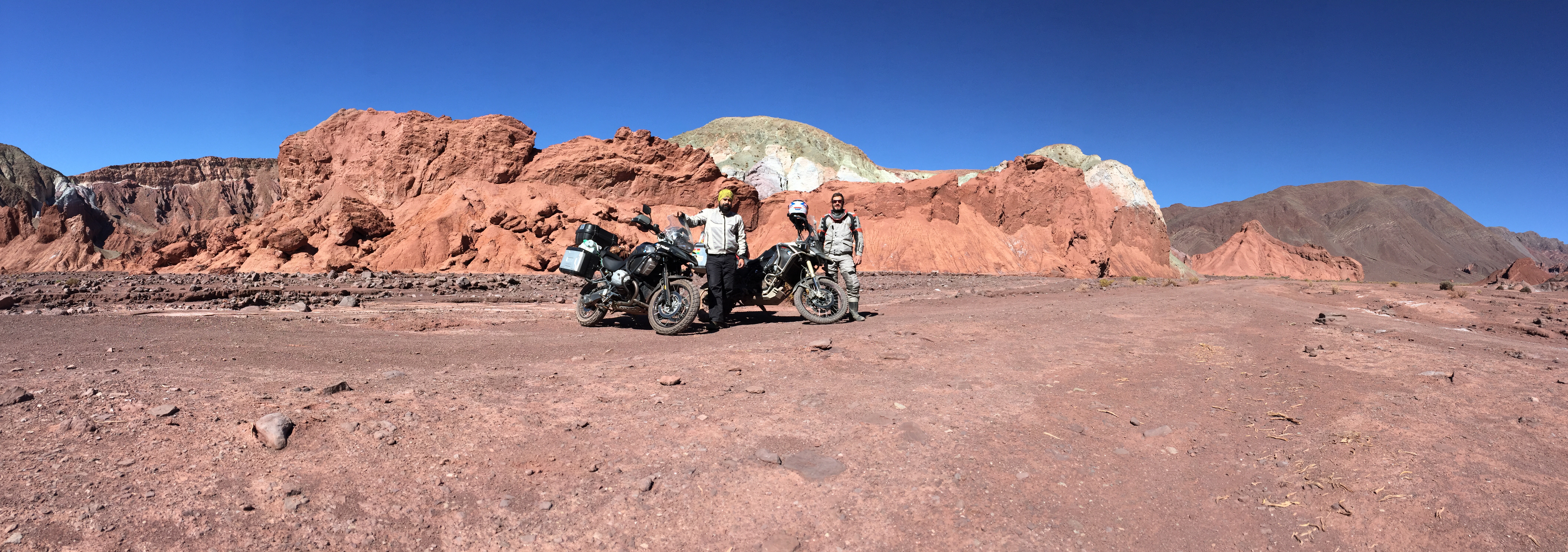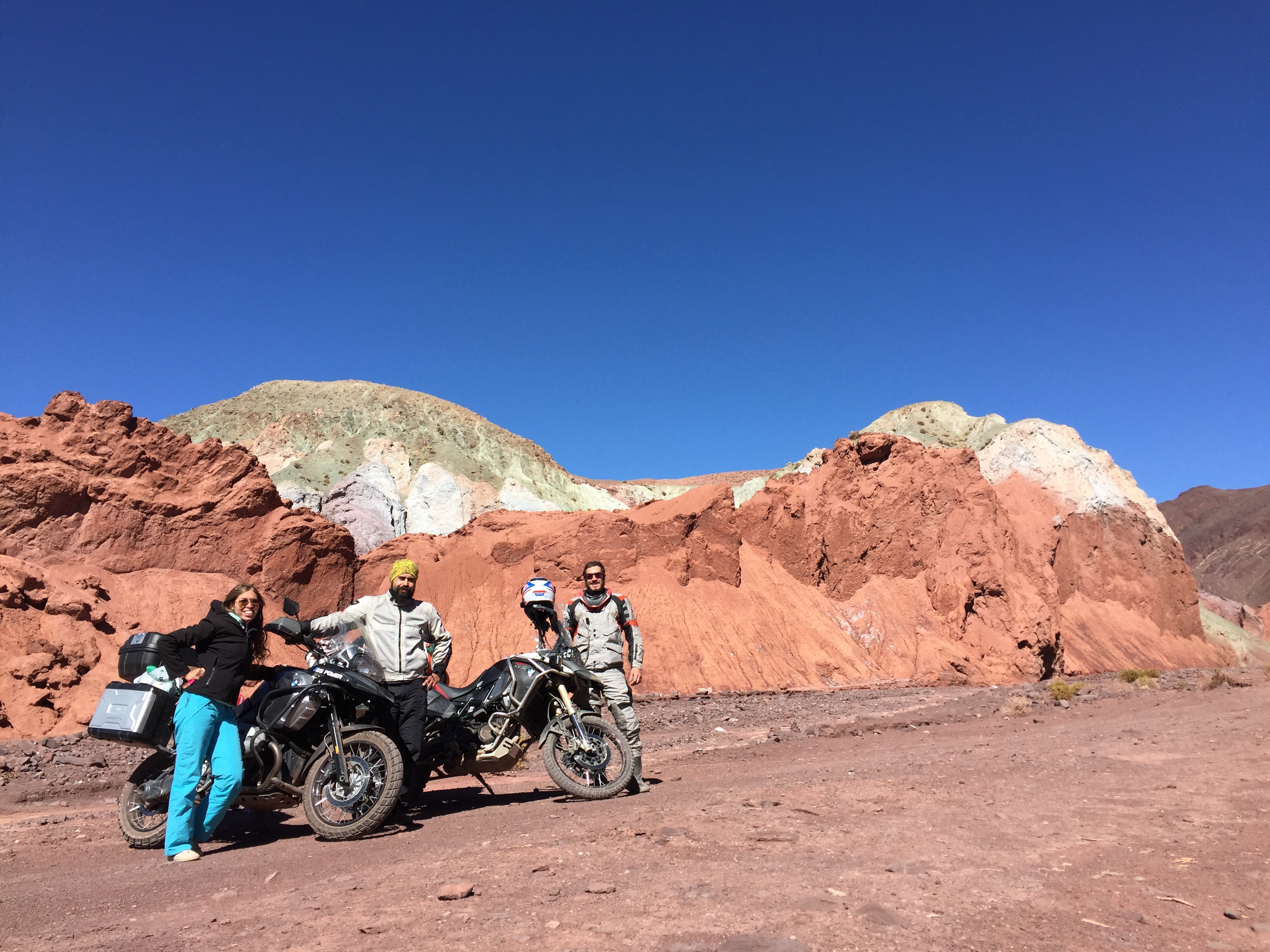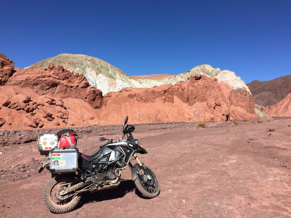 Otro día de tramo largo. Quedé en encontrarme con Cristian y Patricia a las 8:00 a.m. Salimos para el Valle del Arcoiris, a 60 km de San Pedro, vía que lleva a Calama y desviándose en la ruta B-207 (son aproximadamente 10 km off con un poco de arena). Cuando estábamos llegando, Cristian se enterró en la arena, me bajé a ayudarle y la pata de mi moto se enterró y la moto para el piso… Nada grave, le ayudé a Cristian y después me ayudó con mi moto.
