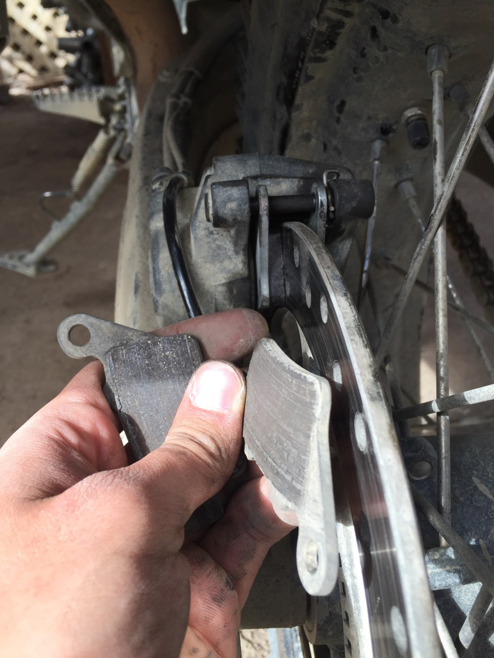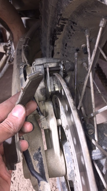 Después de eso, a cambiar las pastillas de freno trasero. Pensé que iba a ser más simple, pero el pin de seguridad que tiene, estaba más pegado que la concha… Creo que es de tanto barro/tierra/polvo/sal/agua/etc., etc. que ha chupado durante el viaje.