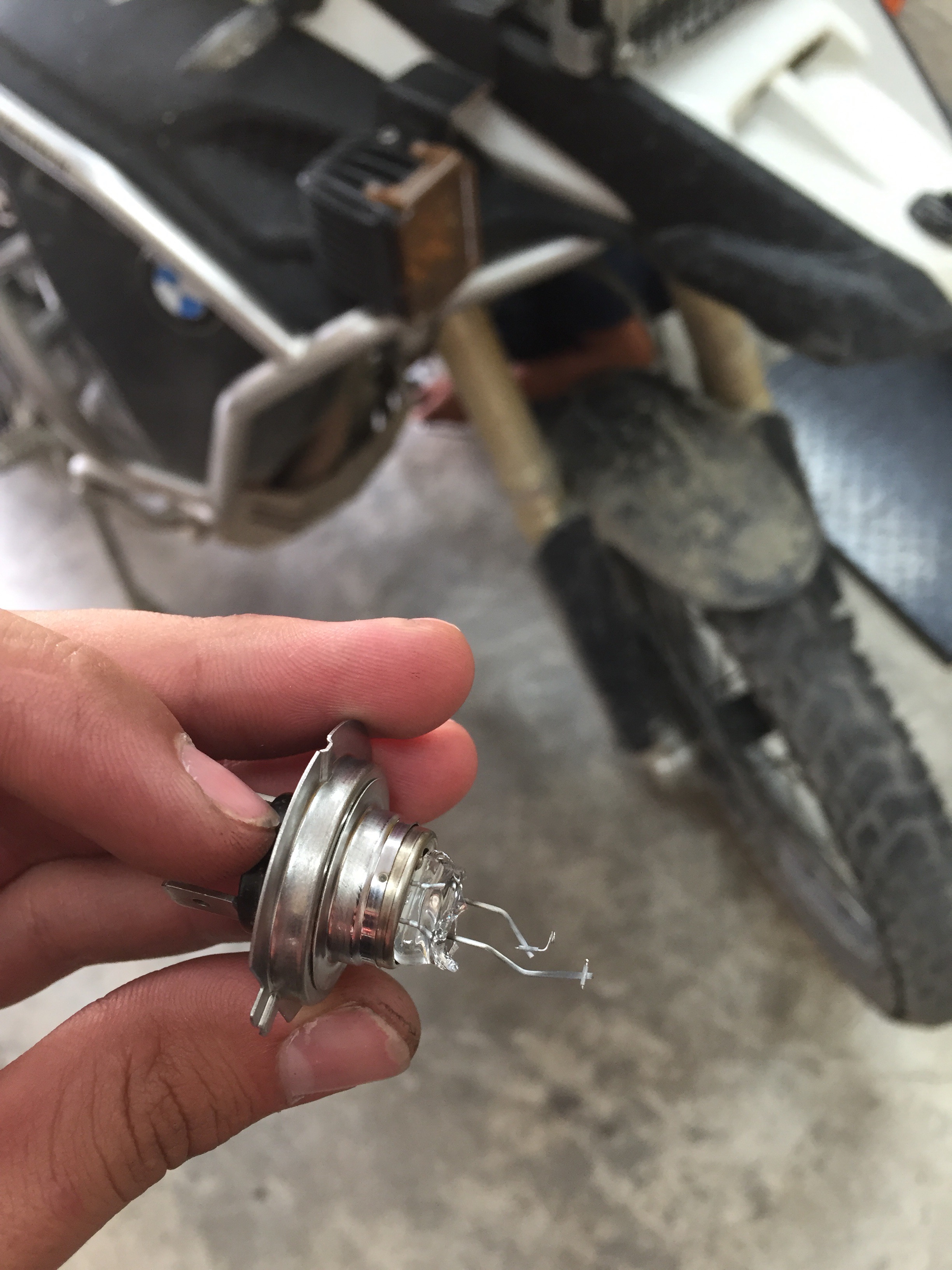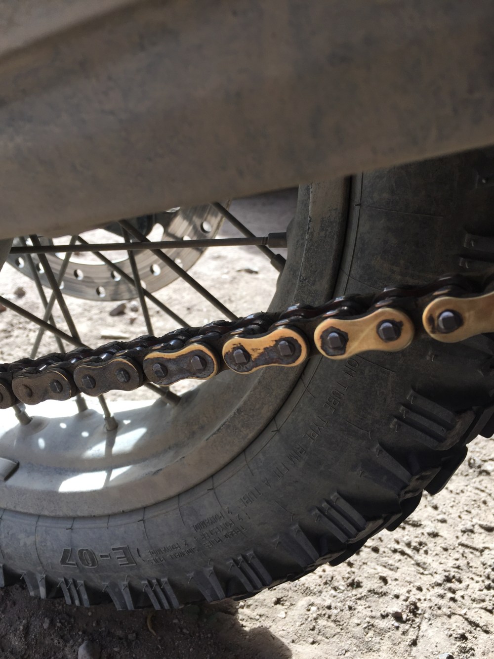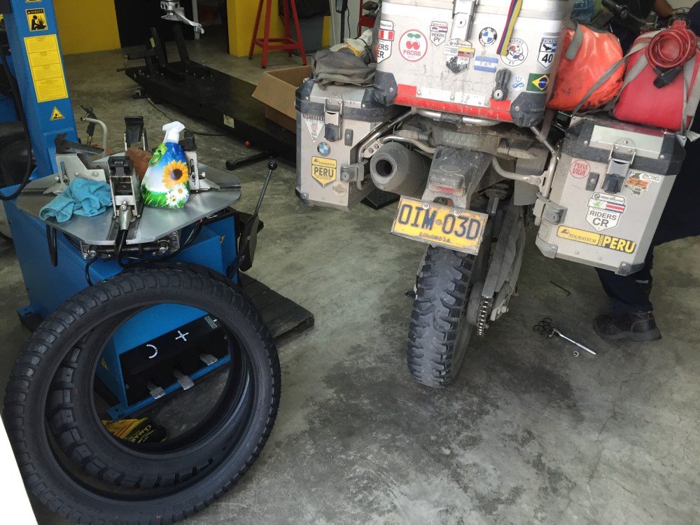 Afortunadamente llegué media hora antes de que cerraran. Allá pude cambiar el bombillo (el cual se estalló, aparentemente por la vibración de la trocha de ayer a lo que se le pudo sumar la altura a la que estuve), me lavaron y ajustaron el kit de arrastre y cambie la llanta y neumático delantero (estaba usando Heidenau y me duró 27 mil km… Nada mal).