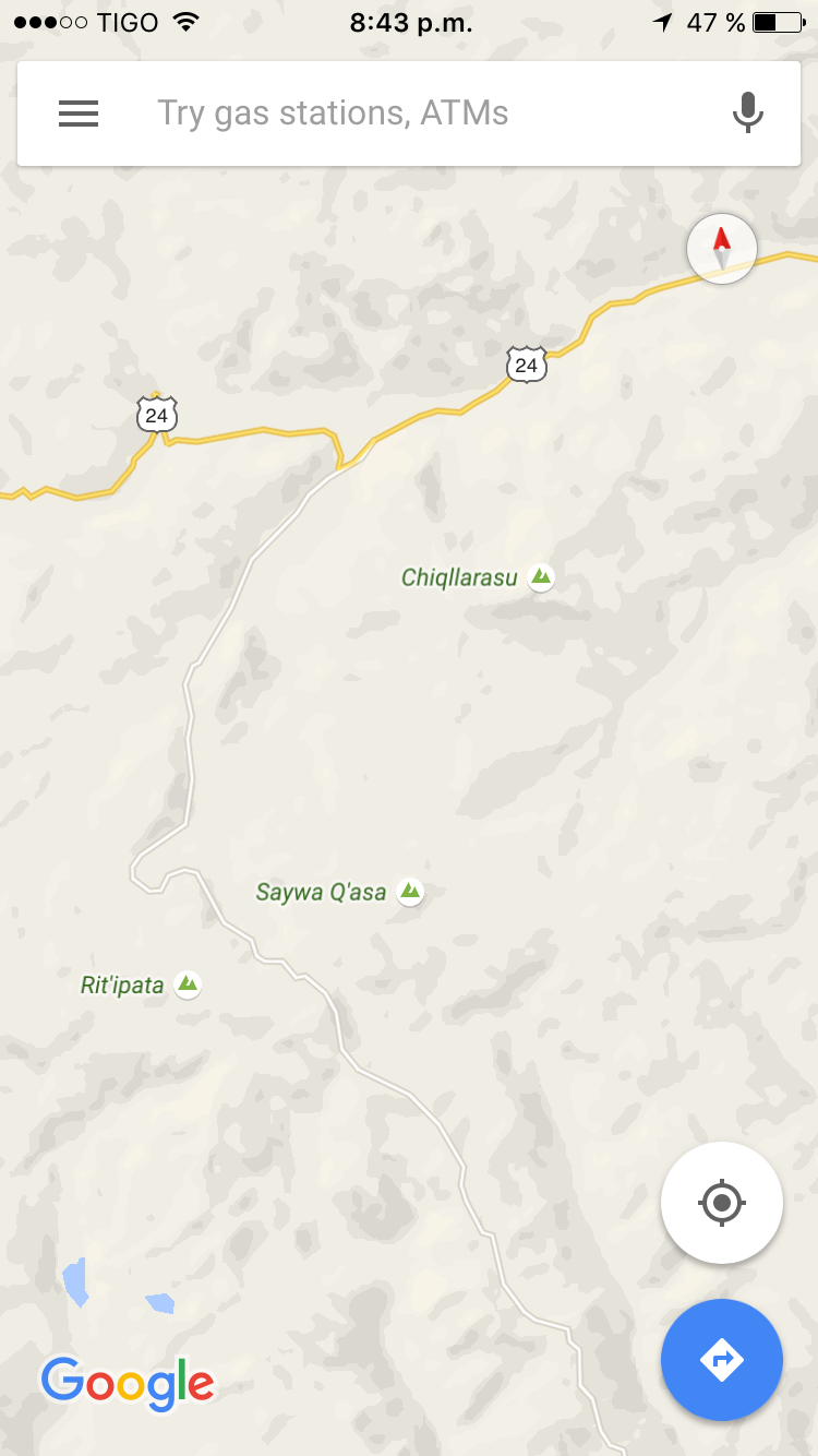 Cuando llegan a un puente en San Lucas, toman la vía PE-24A que después se vuelve a convertir en la PE28-A, ¿por qué? Claramente no lo sé. En Google Maps me aparece como la vía 24 (prefiero usar Maps.me). Esta vía los lleva a Pisco y a la Panamericana sur (PE-1S).