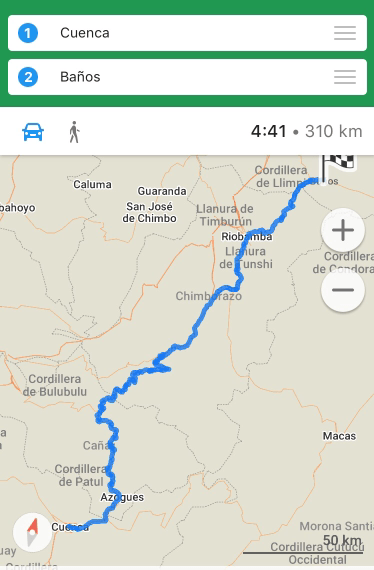 Me monté, eché gasolina en una estación cercana a la frontera y seguí con mi ruta planeada (que era llegar a Cuenca). Ruta E25 hasta la E59. Las cámaras de velocidad me tuvieron que haber tomado más fotos que un putas, porque venía dándole como rata en balde… Un tramo antes de Máchala y de desviarme a la E59, empezó a llover y ni siquiera paré a ponerme el impermeable (mucho menos a tomar fotos). Subí por la sierra y ese frío tan triple hp… A más de 4,000 msnm y mojado… No me joda… Qué día el que estoy teniendo… Después de siete horas de haber salido de Máncora, llegué a Cuenca… El que supuestamente iba a ser mi destino final… Pensándolo por unos minutos, decidí seguir hasta Baños de Agua Santa (como a 310 km). Eran las 5:00 p.m. y sabía que llegaría bastante tarde y que la vía no era la mejor, porque es por toda la sierra y hay demasiadas curvas. Aun así, seguí… La vía que tomé, es la E35. Todo iba excelente hasta que como dos horas después, empezó a lloviznar otra vez y la vía se nubló…