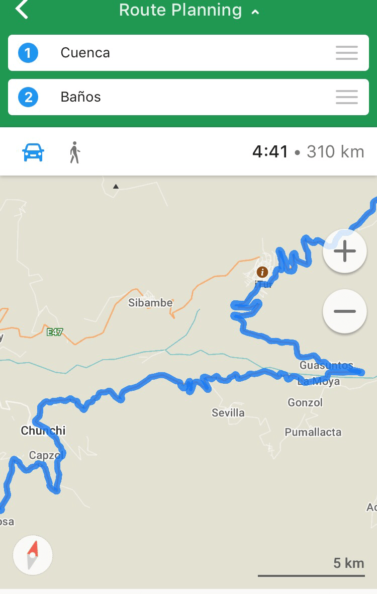 Al llegar a Riobamba, la vía estaba en construcción y me tocó meterme por unas trochas hasta dar con la carretera que me llevaría a Baños… A estas alturas ya estaba harto de la moto y lo único que quería era llegar a dormir.