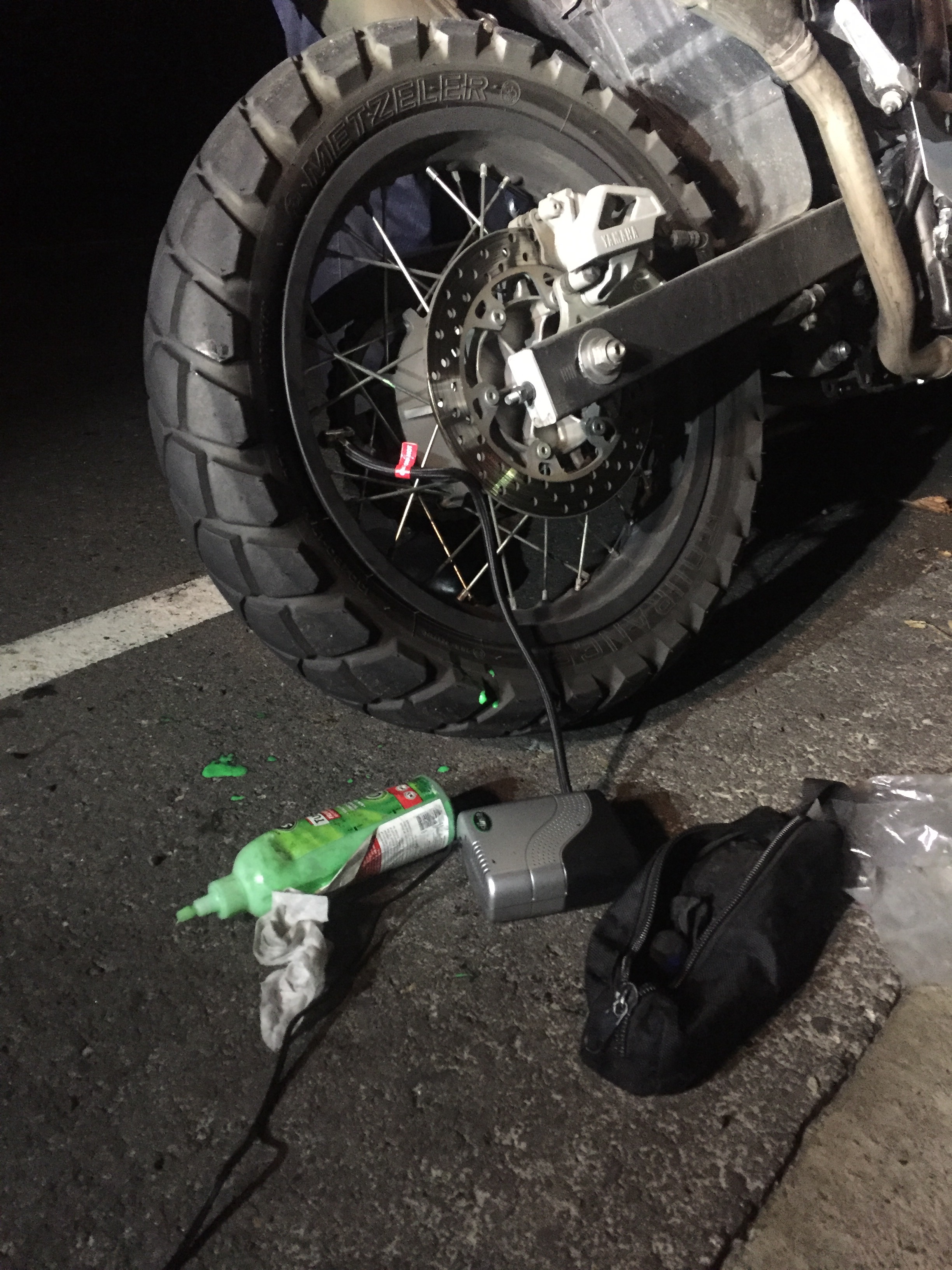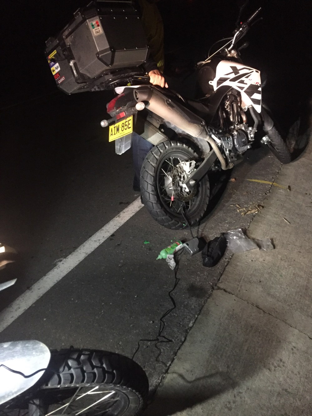 De Buga salimos rumbo a La Pintada, donde todos seguirían para Medellín y yo me desviaría para Támesis. Nos tocó el diluvio universal y claramente ya había oscurecido, entonces tocaba ir más despacio. A unos 80 km de llegar a La Pintada, se nos pinchó un Parcero de una XT660. Traté de desvararlo con el gel antipinchazo, pero la cosa estaba grave. Afortunadamente había un montallantas a unos pocos km de distancia y pudimos cambiar el neumático por uno de los que yo llevaba de repuesto.