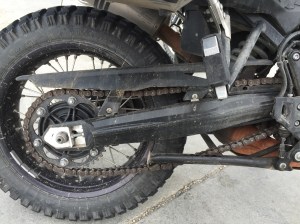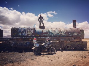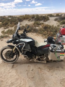 Bombillos, fusibles, una cadena, pastillas de freno delanteras y traseras (sólo utilicé un juego de traseras, ya que las cambié antes de salir… Como uno se mantiene es candeleando en carretera, no necesita frenar tanto como con el tráfico de una ciudad). Filtros de aire y aceite (los usé, pero siempre coincidí con un concesionario BMW Motorrad donde tenían estos repuestos. Los llevé por si alguna emergencia en el camino y tenía que cambiarlos en un pueblo X). Voltímetro, también fue exagerado… Palancas y rim savers para cambio de neumático (clave, aunque no los usé), goma antipinchazo Slime (esta me salvó la vida en Perú), inflador eléctrico y medidor de aire (claves, claves… Ni se les ocurra salir sin esto). Una guevonada (que se me va el nombre) para quitarle el gusanito de la válvula de la llanta, «despinador» de cadena, candados para cadena, neumáticos de repuesto (uno trasero y uno delantero (clave, usé el delantero), lubricador de cadena (muy importante) y la herramienta para cambiar llantas, tensionar cadena, quitar tapas de carenado, batería, filtros y un cargador de batería. Mejor dicho, llevaba era puros repuestos. Ah, también llevaba carpa, colchón inflable e inflador (sólo lo usé tres noches en Uyuni), el colchón inflable lo utilicé como 10 días en total.